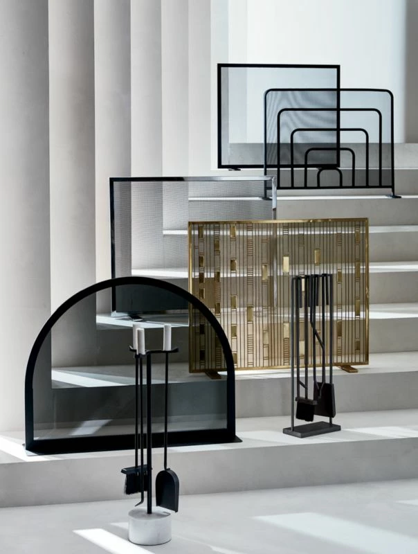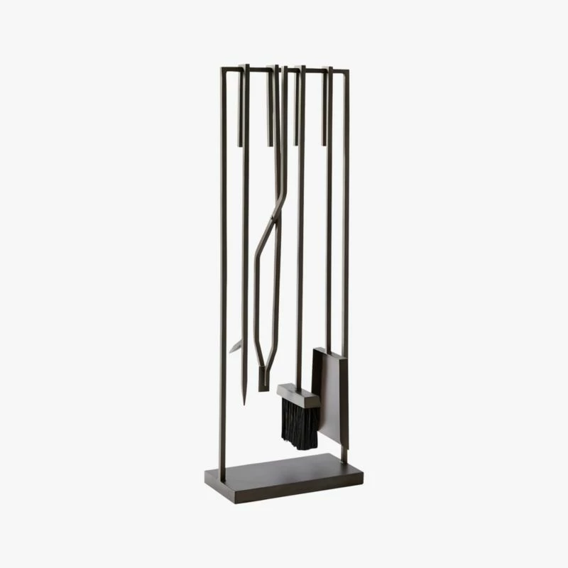 Handcrafted of iron with raw steel finish, refined fireplace tools hang out of the way for a clear view of the hearth. Shovel, broom, poker and tongs hook over freestanding bar via sleek squared-off handles. Tends the fire indoors or out. CB2 exclusive.