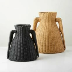 Museum-worthy vase is stunningly sculptural with an oversized hand-thrown shape and a cold matte black glaze to finish things off. Handles are wrapped in naturally dyed raffia to add a pop of unexpected texture to your arrangement. CB2 exclusive.