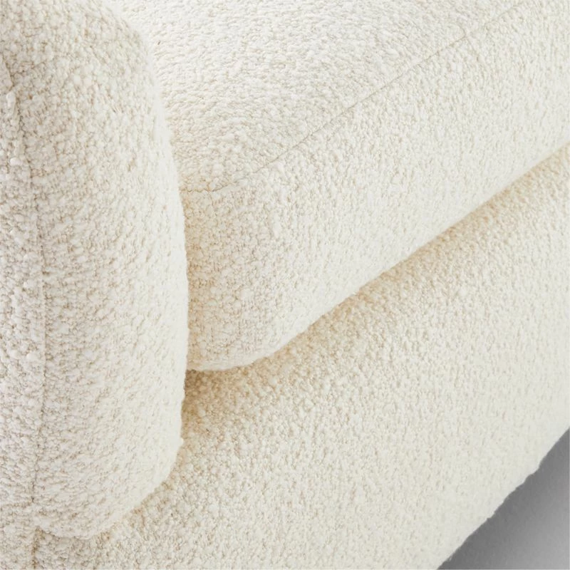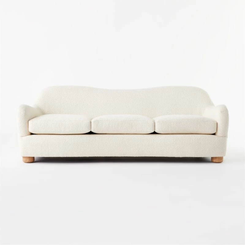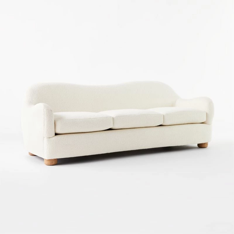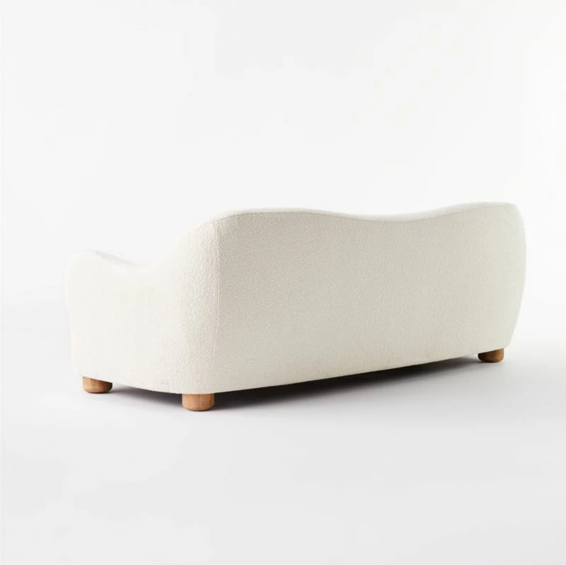 Boucle takes on cream-colored hues in loungeable sofa designed by Ross Cassidy. Bubbly in shape with rounded legs of solid bleached oak and an oversized silhouette made for spreading out. CB2 exclusive.