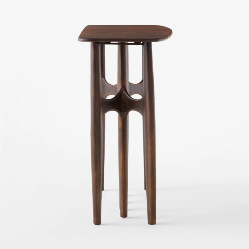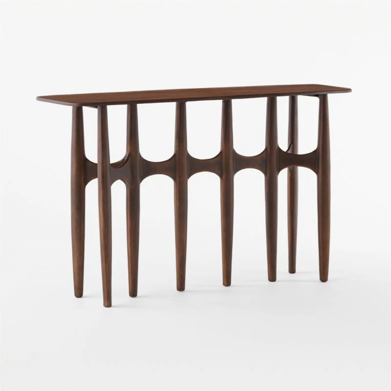 Leggy Brutalist-inspired console table designed by Amanda Ip of Slate Design makes a statement anywhere it stands. Textured cast aluminum with dark bronze powdercoated finish. Super subtle demi-lune shape curves in front with a flat back to style against the wall. Learn more about Amanda Ip on our blog. CB2 exclusive.