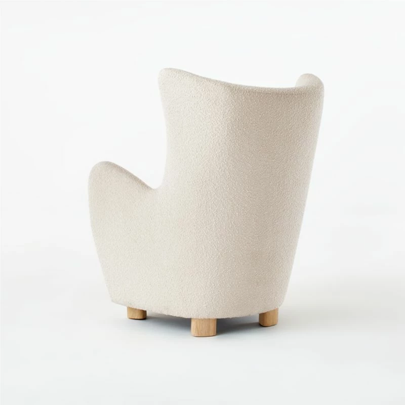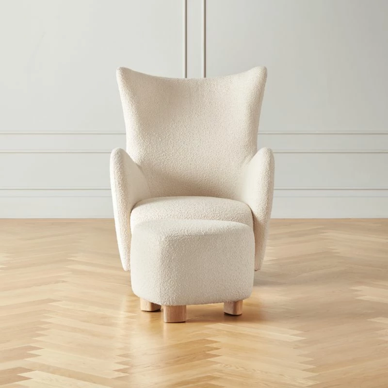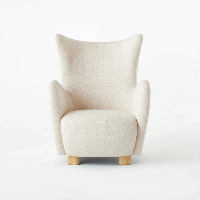 A modern take on a classic wing chair. Designer Ross Cassidy brings his signature flair to a popular silhouette by wrapping it entirely in luxe ivory boucle. Bleached oak feet are asymmetrical and wire-brushed for a special design detail, with matching asymmetrical ottoman sold separately. Framed out in FSC ®-certified wood. CB2 exclusive.