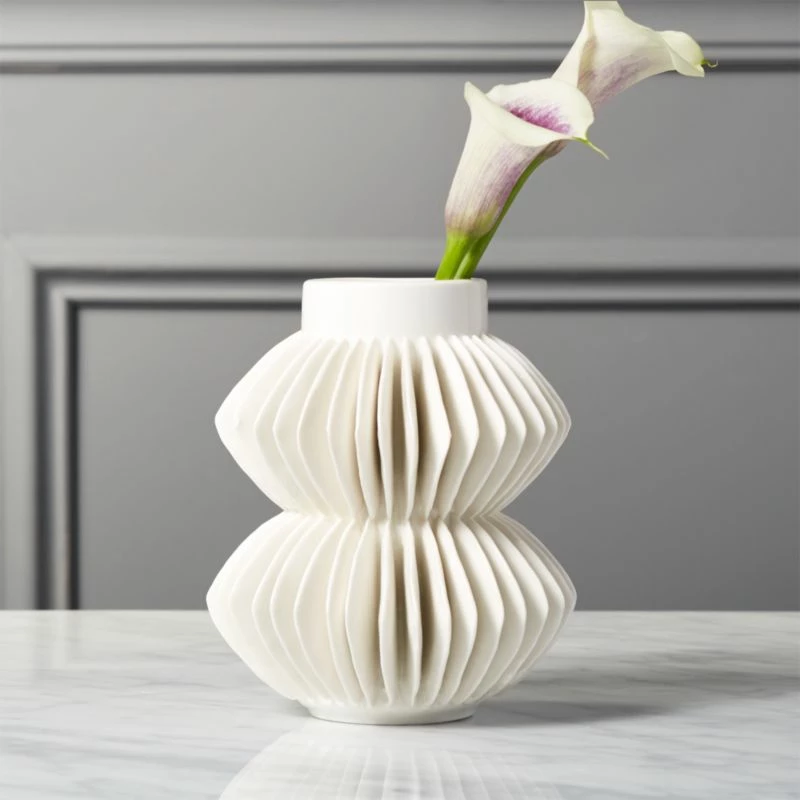 Modern Italian curves take 3-D turn in porcelain vase. Each rib is applied by hand to cylindrical base. Watertight for blooms.