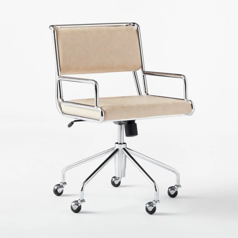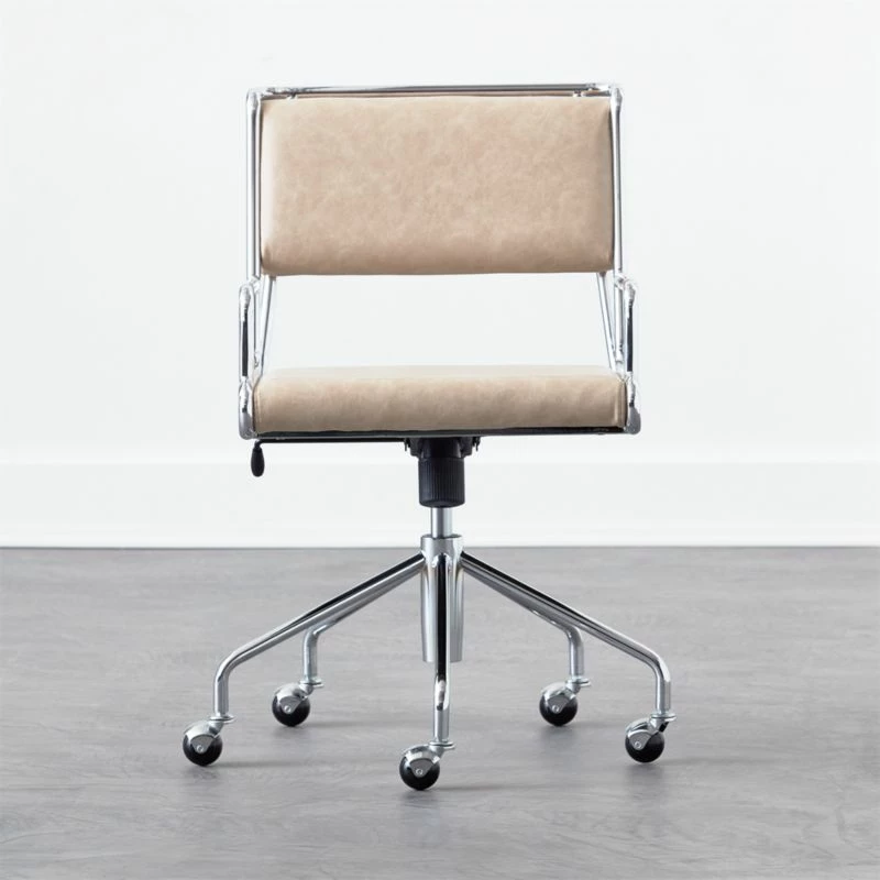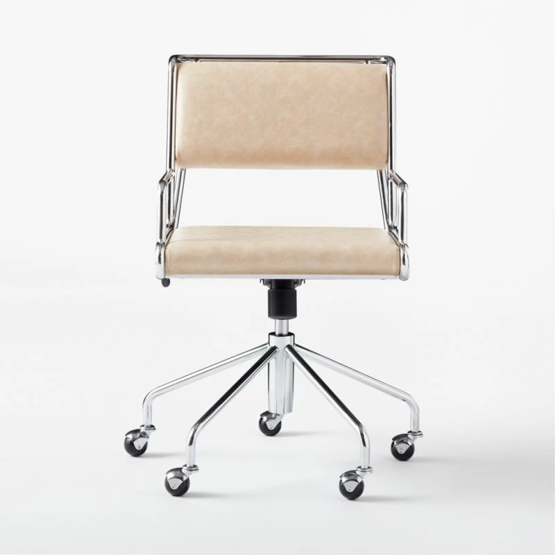 Designed by Barcelona-based Mermelada Estudio, this vintage-inspired office chair has a distinctly French industrial vibe. Polished nickel frame shows off soft vegan leather in a warm nude tone. Height is adjustable. A swivel base and rolling casters round out the details. Learn about Mermelada Estudio on our blog. CB2 exclusive.
