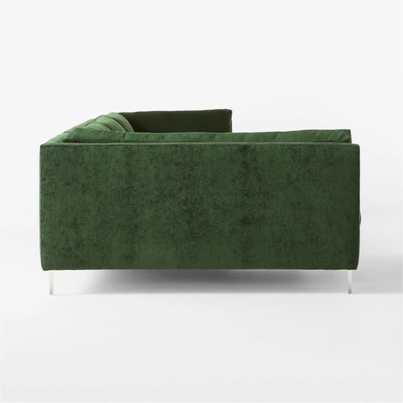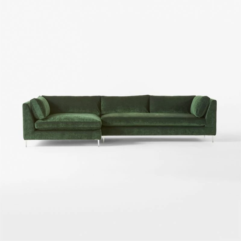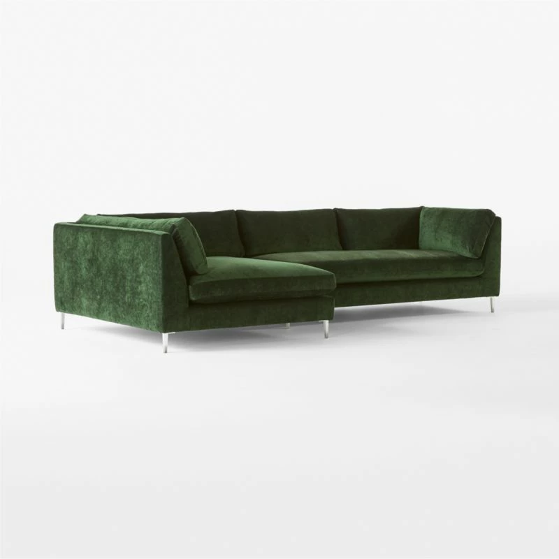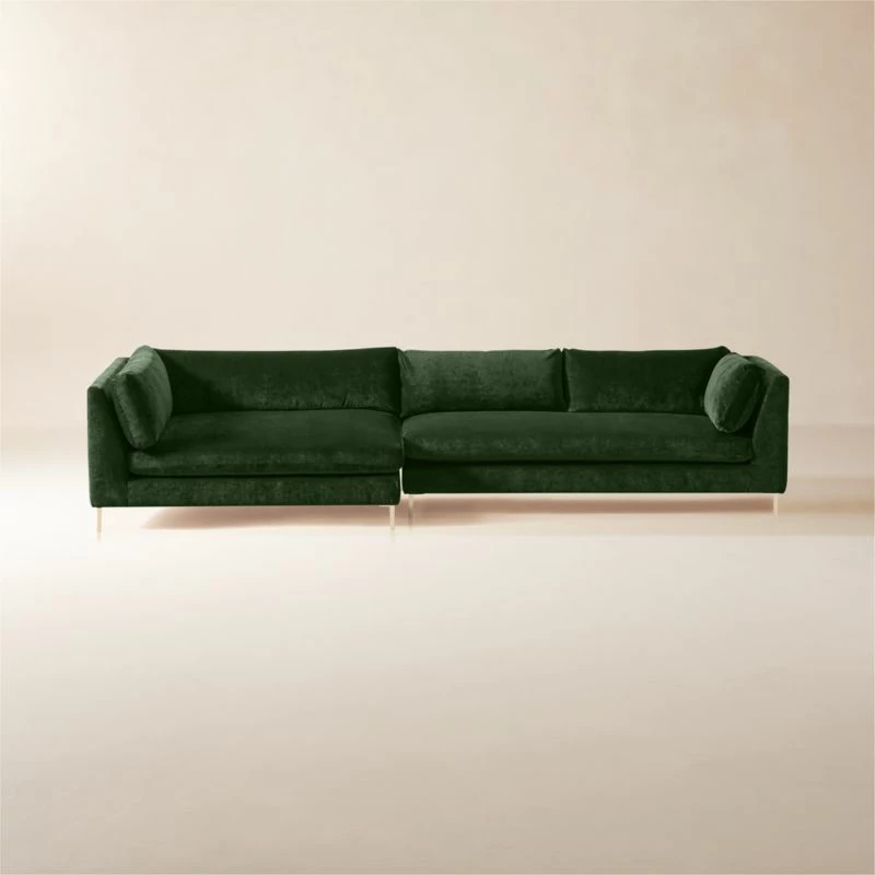 Generously scaled armless sofa provides extraordinary comfort. Tailored in a performance velvet, two-piece sectional sits deep and spacious with the perfect balance of slouch and support. Cushions will continue to relax over time for a casual, comfortable look, all elevated on tapered legs that add a subtle gleam in brushed aluminum. Clean silhouette is accented by a left-arm chaise that offers opportunities to stretch out and unwind. CB2 exclusive.