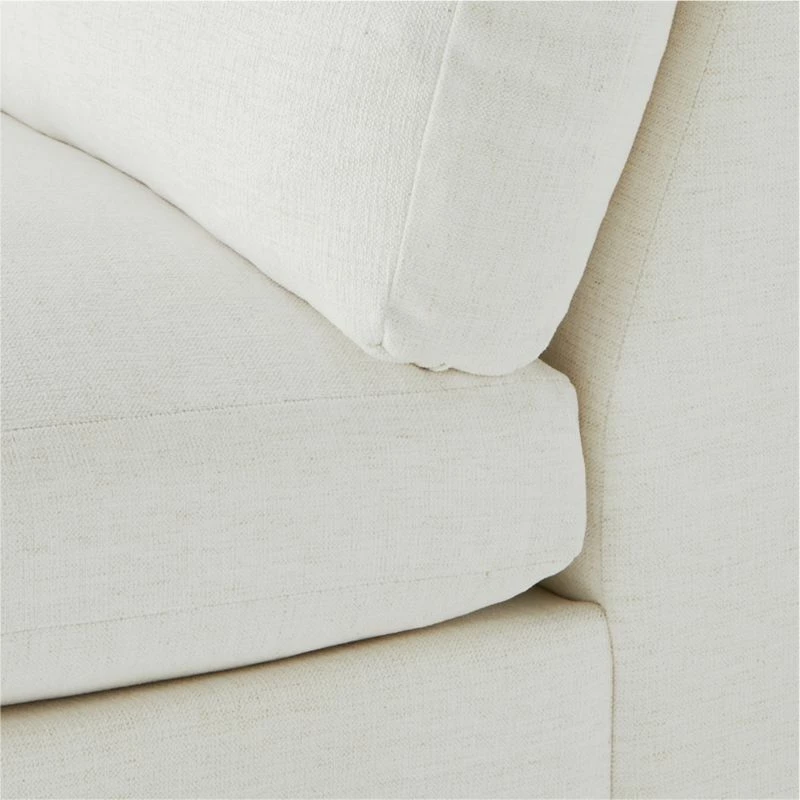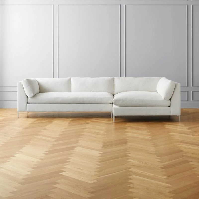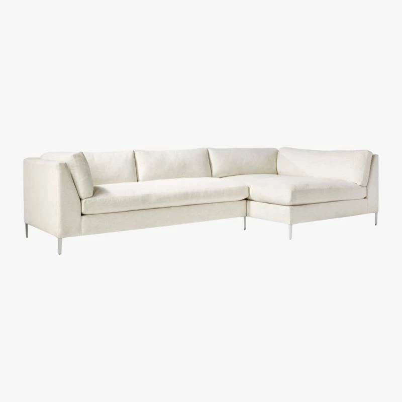 Generously scaled armless sofa provides extraordinary comfort. Tailored in snow white performance fabric, two-piece sectional sofa sits deep and spacious with the perfect balance of slouch and support. Cushions will continue to relax over time for a casual, comfortable look, all elevated on tapered legs that add a subtle gleam in brushed aluminum. Clean silhouette is accented by a right-arm chaise that offers opportunities to stretch out and unwind. CB2 exclusive.
