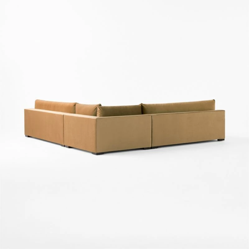 Upholstered in a rich copper performance velvet, large-scale sectional sits low to the ground for modern appeal. The plush silhouette features pillow-like detached cushions with broad armrests that can serve as a relaxed perch for socializing. Sectional pieces can be configured to suit your space. CB2 exclusive.