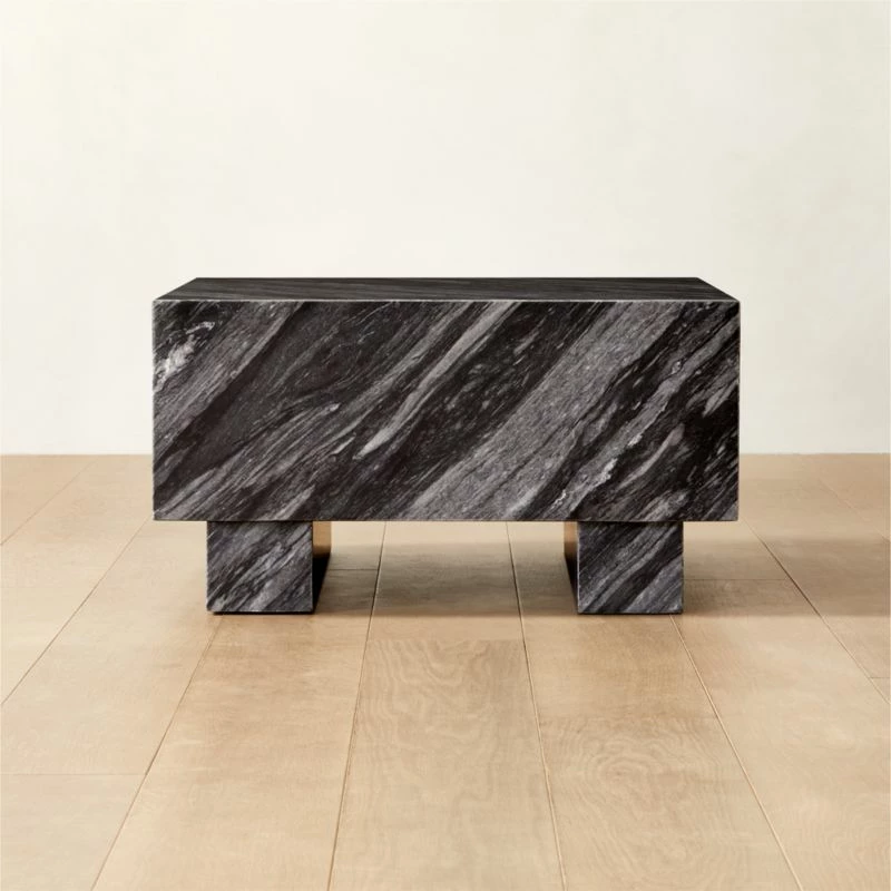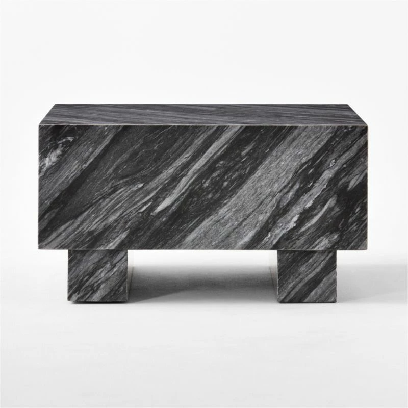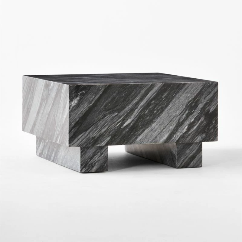 Inspired by ancient post-and-lintel construction, oversized square coffee table by VUUE has a bold, architectural form. Highly active blue Florence marble features prominent veining in cool tones of grey; due to the natural beauty of the stone, each piece is unique. Scaled to complement large sectionals and spacious rooms, this low table makes a graphic statement in its simplicity. CB2 exclusive.