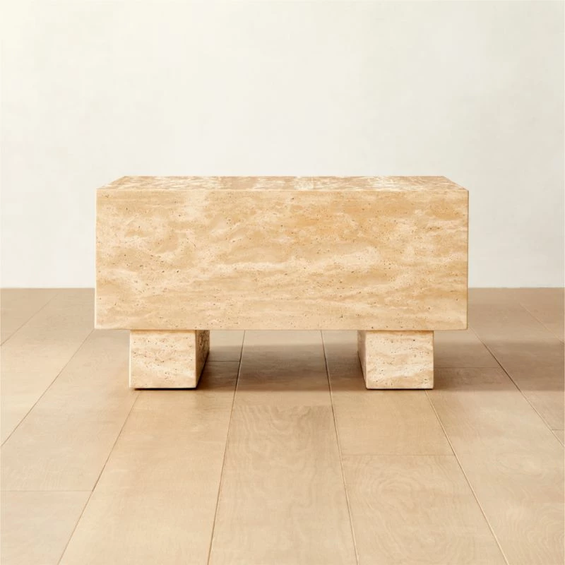 Inspired by ancient post-and-lintel construction, oversized square side table by VUUE has a bold, architectural form. Warm yellow travertine features prominent veining and varying tones; due to the natural beauty of the stone, each piece is unique. Scaled to complement large sectionals and spacious rooms, this low table makes a graphic statement in its simplicity. CB2 exclusive.
