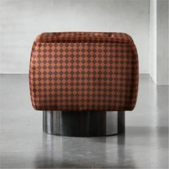 Featuring flat biscuit tufting, pillowed sides and an oversized bronze chrome base, this patterned ottoman makes a statement in any room. Upholstered in luxe velvet fabric featuring an original print developed by Kravitz Design exclusively for this collection. CB2 exclusive.