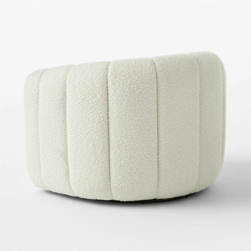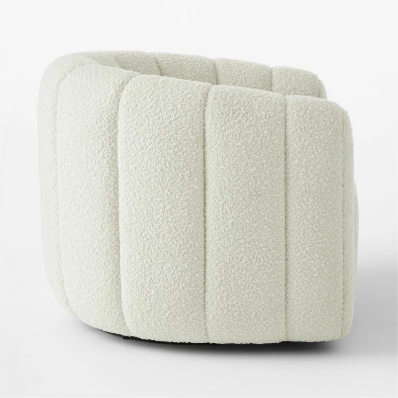 Channel-tufted in rich white boucle, deco-inspired chair makes a vintage statement wherever it sits. Designed by VUUE and made with wood certified sustainable by the Forest Stewardship Council ®, swivel chair looks good from every angle. CB2 exclusive.