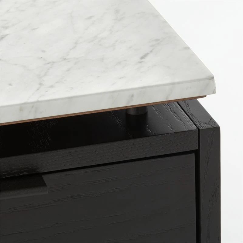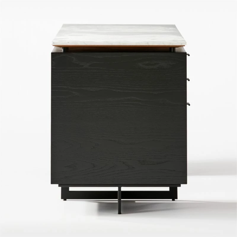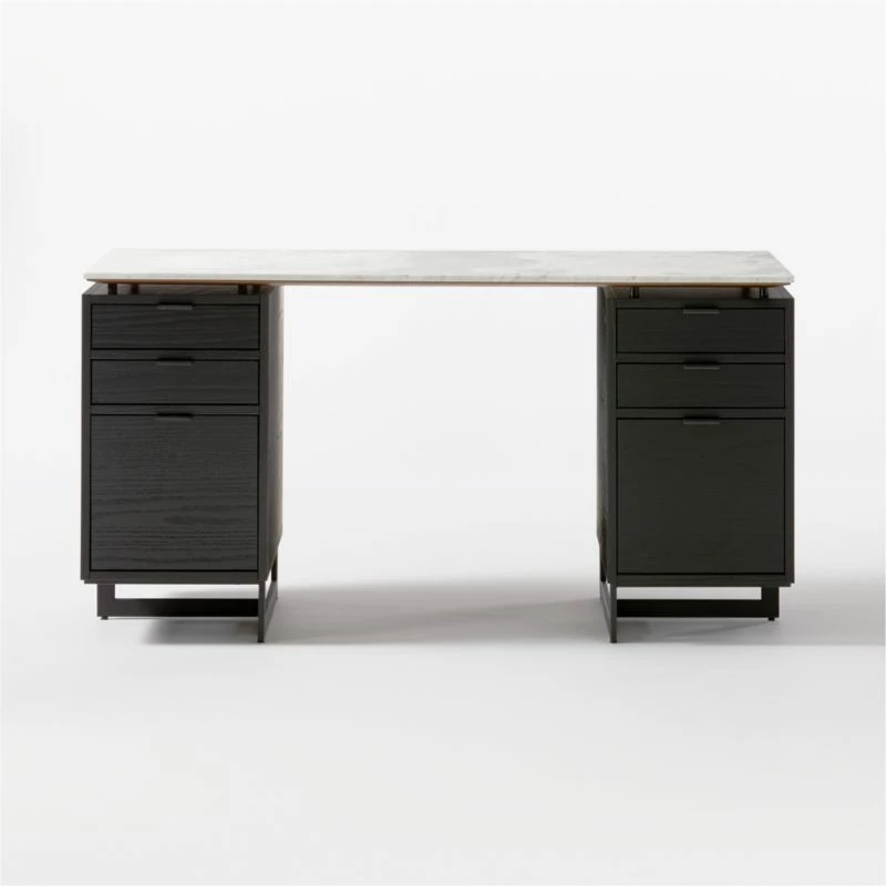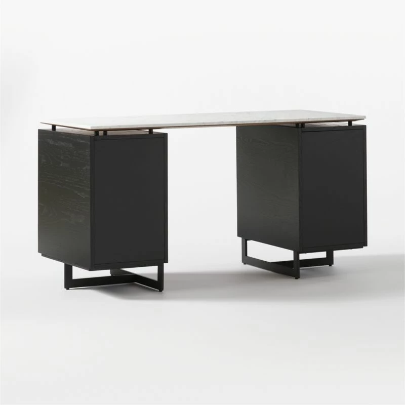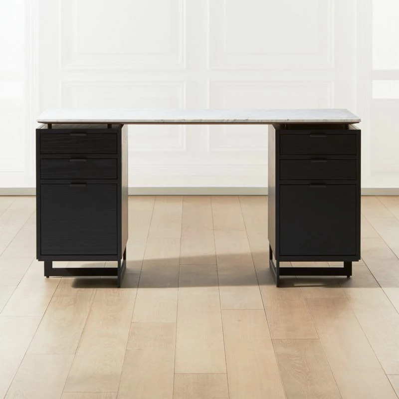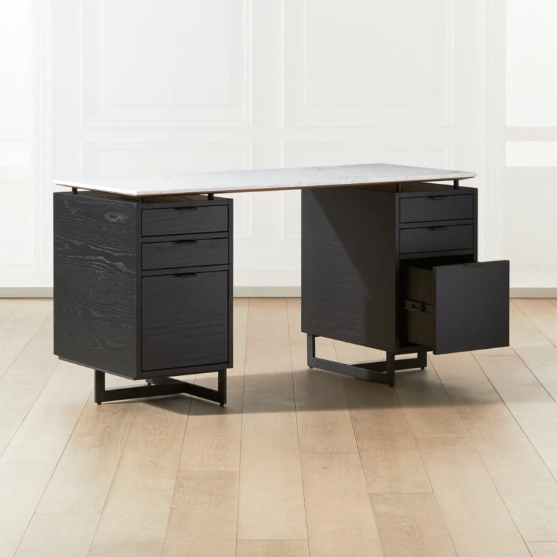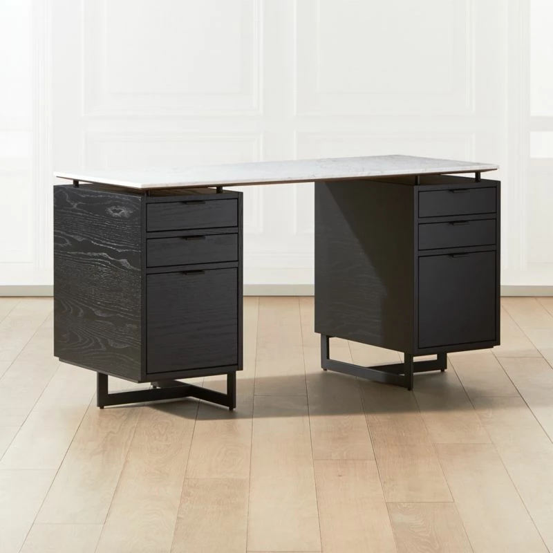 Black oak and metal desk works hard round the clock. Set of drawers makes space for desk accessories, with a bottom drawer designed for hanging files. White marble tops if all off with sophistication. Learn about VUUE on our blog. CB2 exclusive.