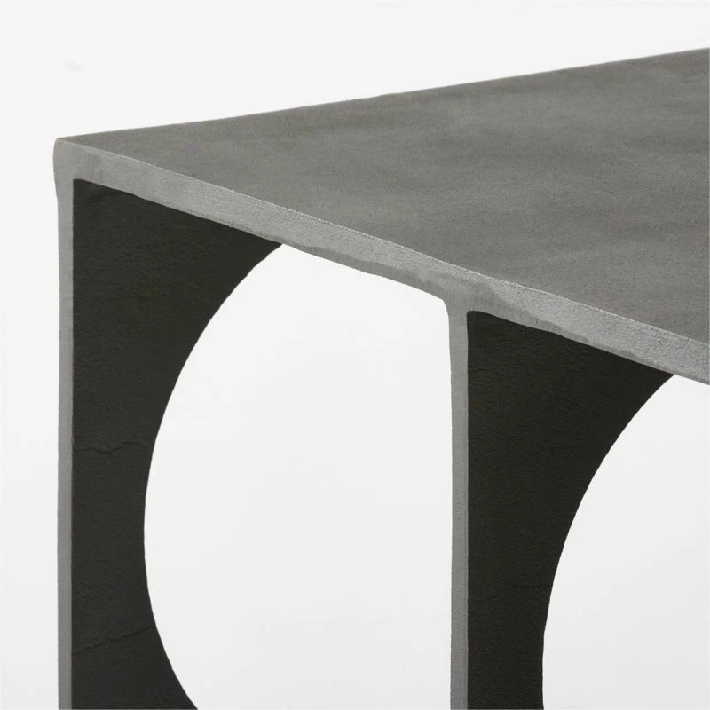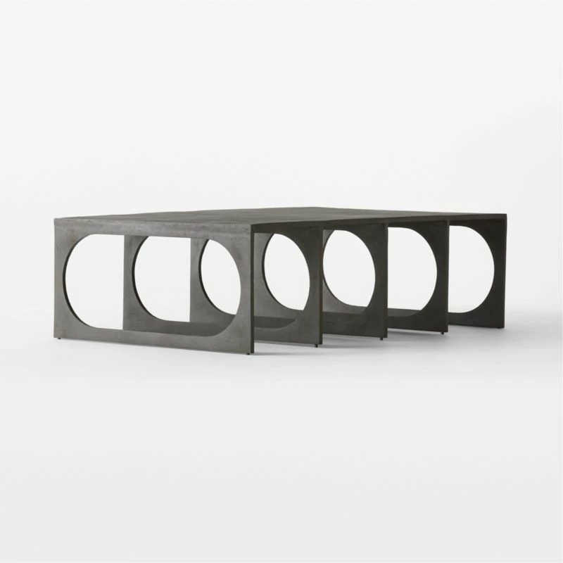 Statement coffee table by Mermelada Estudio captures interest through silhouette and cast texture. Handcrafted design, the sand cast aluminum is coated with a matte gunmetal finish with tonal variation throughout. A simple tabletop rests on legs with repeating oval cutouts, making a compelling sight from any perspective. CB2 exclusive.