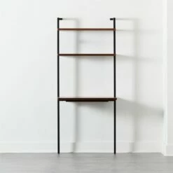 Party on top, business on the bottom. Three fixed walnut veneer shelves ladder up alongside a powdercoated metal frame and pull double duty as a display/work space. Modularly designed to save room and stand next to our matching Helix walnut bookcase. Stud mounting recommended; hardware included for drywall installation. CB2 exclusive.