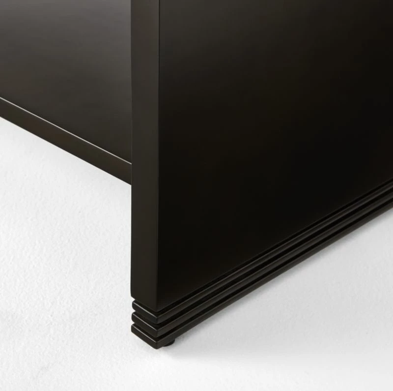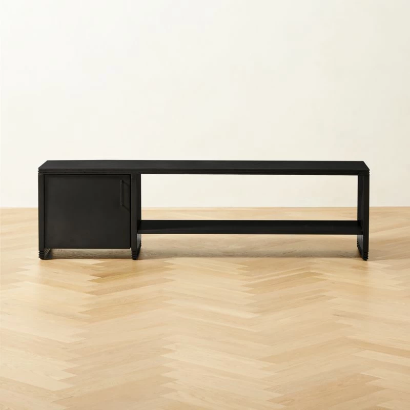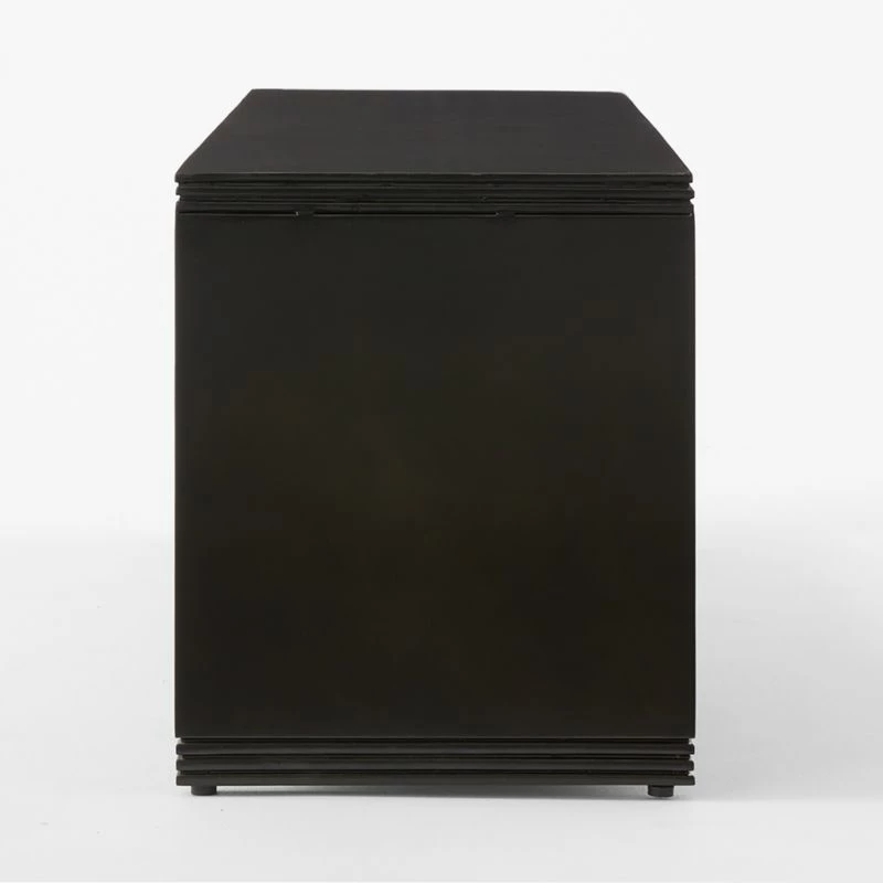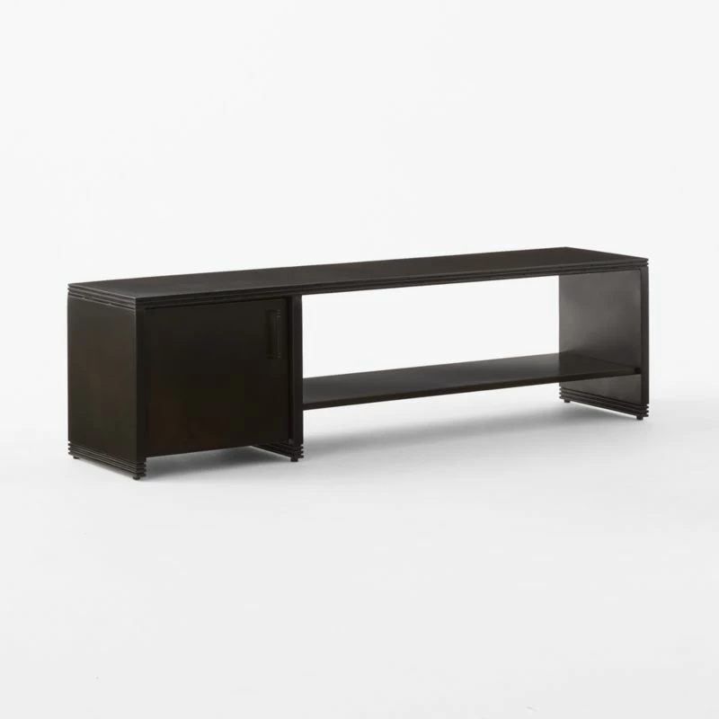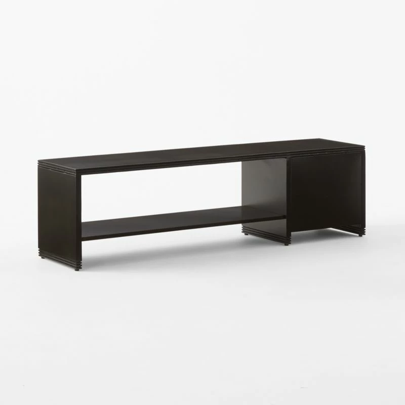 Designed by Jannis Ellenberger, storage bench is characterized by a blackened stainless steel finish and architectural detailing for a refined take on shoe storage. CB2 exclusive.
