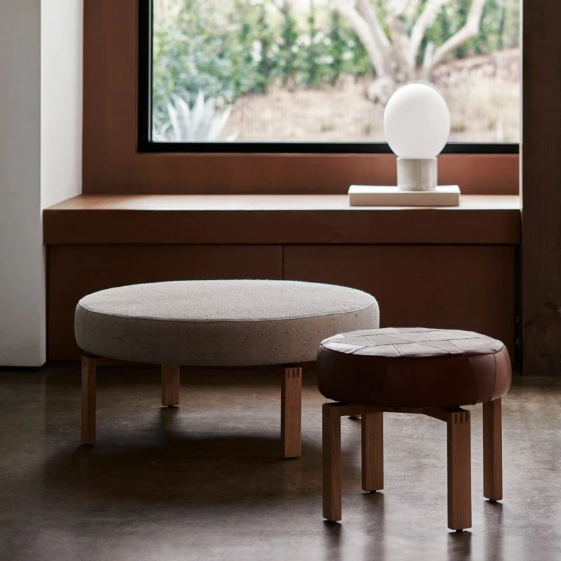 California design duo Lawson-Fenning’s appreciation of craftsmanship and honest materials comes through in low-slung ottoman. Boxy, angular base is made of oak certified sustainable by the Forest Stewardship Council ®, with solid wood legs coming together through exposed box joinery—a sign of high-quality detail borrowed from the Arts and Crafts movement. Atop the four legs, a circular cushion in luxurious caramel leather patchwork plays against the angularity elsewhere in the piece. CB2 exclusive.