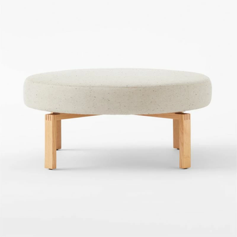 California design duo Lawson-Fenning’s appreciation of craftsmanship and honest materials comes through in low-slung ottoman. Boxy, angular base is made of oak certified sustainable by the Forest Stewardship Council ®, with solid wood legs coming together through exposed box joinery—a sign of high-quality detail borrowed from the Arts and Crafts movement. Atop the four legs, a circular cushion in soft, flecked fabric plays against the angularity elsewhere in the piece. CB2 exclusive.