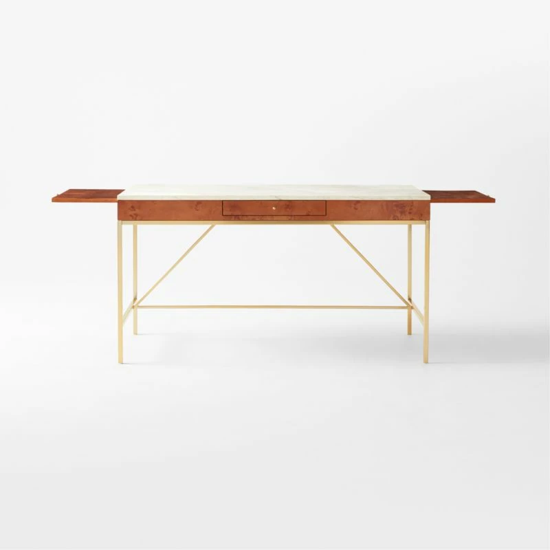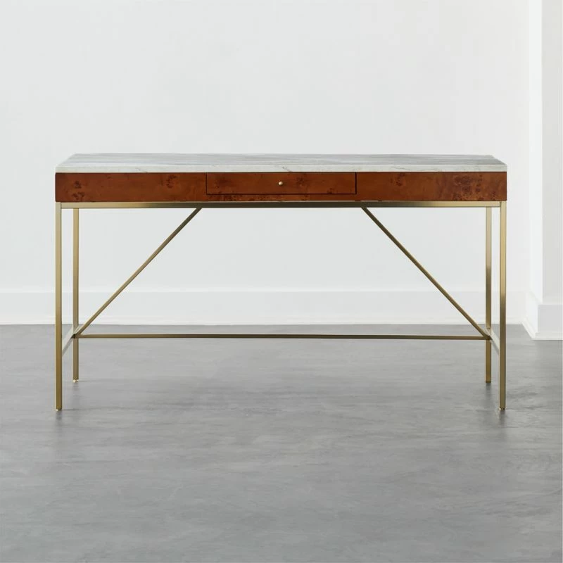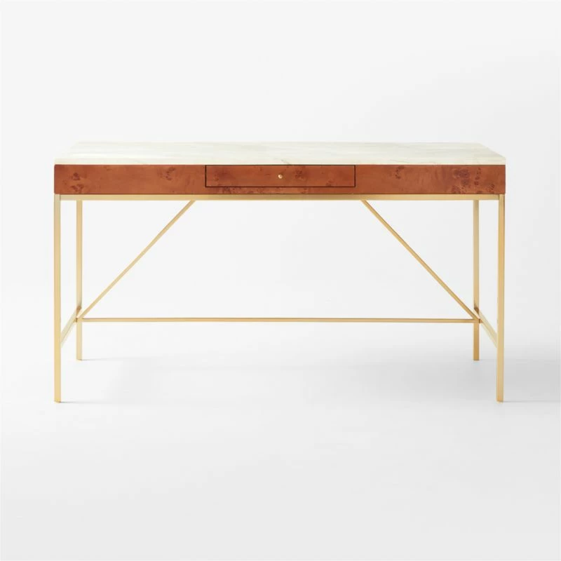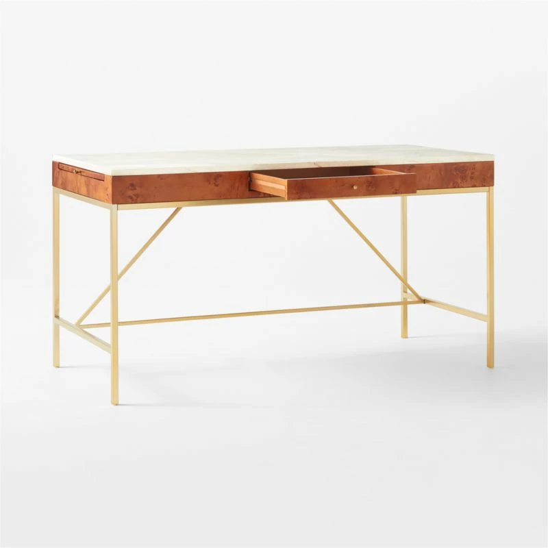 Elegant desk shows off the hallmarks of Paul McCobb’s midcentury designs: simple lines and fine craftsmanship, updated with a mix of materials that feels especially relevant today. Brushed brass legs support a burl wood frame and travertine top with one drawer and two pull-out trays. CB2 exclusive.