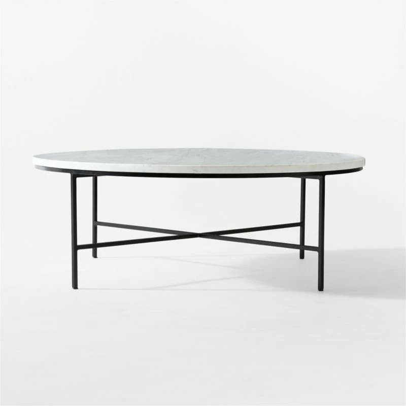 First designed in 1952, the Irwin Collection by Paul McCobb is stunning in its simplicity. Updated in honed white volakas veneered marble with a solid iron rod base and cap feet detail, coffee table showcases the attention to detail and quality typical of classic midcentury design. CB2 exclusive.