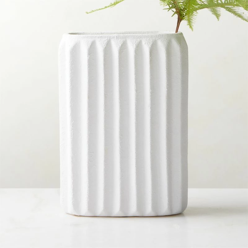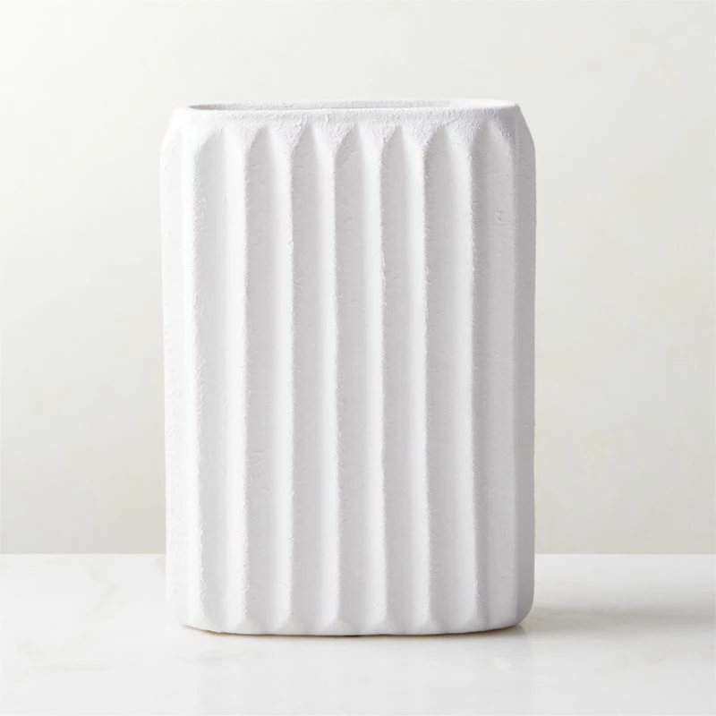 Perfect for windowsills, slim counters and tables, ribbed vase marries a simple rectangular form with the organic character of stoneware. Featuring a wide ribbing detail and a white glaze applied by hand, its architectural presence lends subtle texture to any space, whether displaying greenery or dried botanicals. CB2 exclusive.