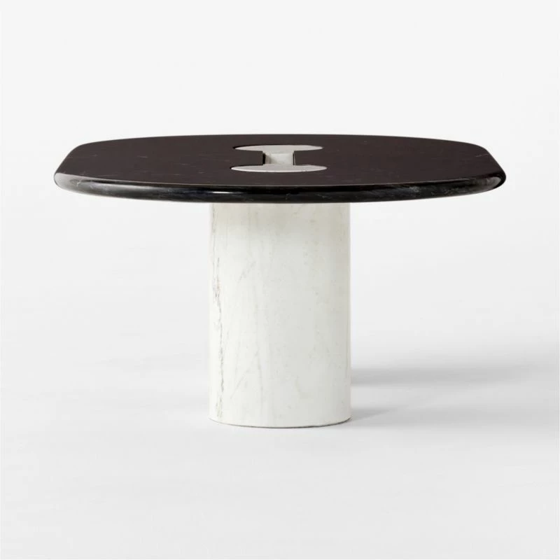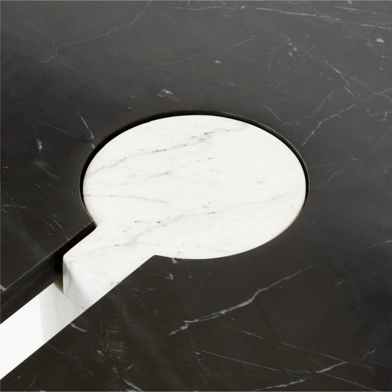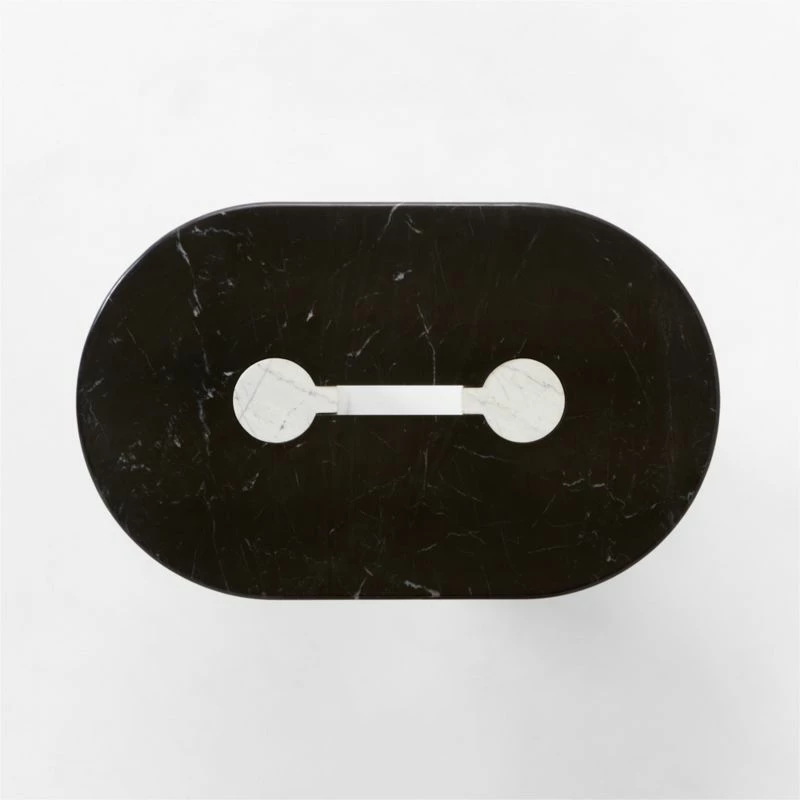 Created by an icon of Italian design, this oval marble coffee table introduces Gianfranco Frattini’s mastery of construction to a new generation of design enthusiasts. A richly veined black Marquina marble top sits atop a solid white Tornado marble base, creating a compelling study in contrast. The elegantly minimal structure is created via massive keyhole connections that are self-supporting and interlocking. Conceptually very simple and aesthetically unique, this marble coffee table’s striking silhouette is at once contemporary and timeless. CB2 exclusive.