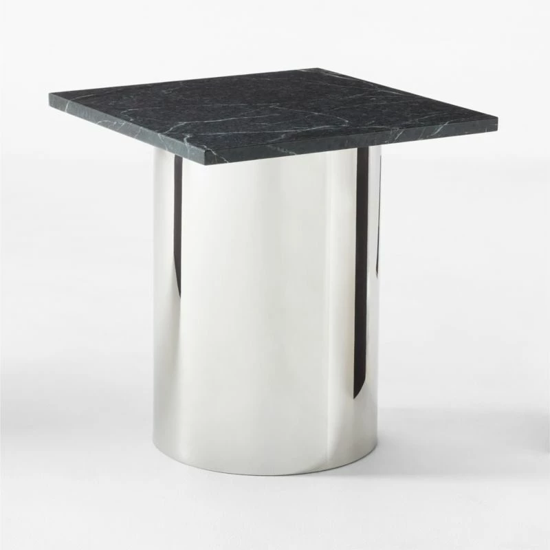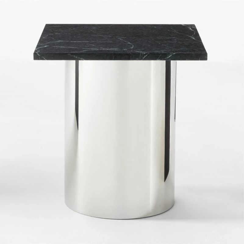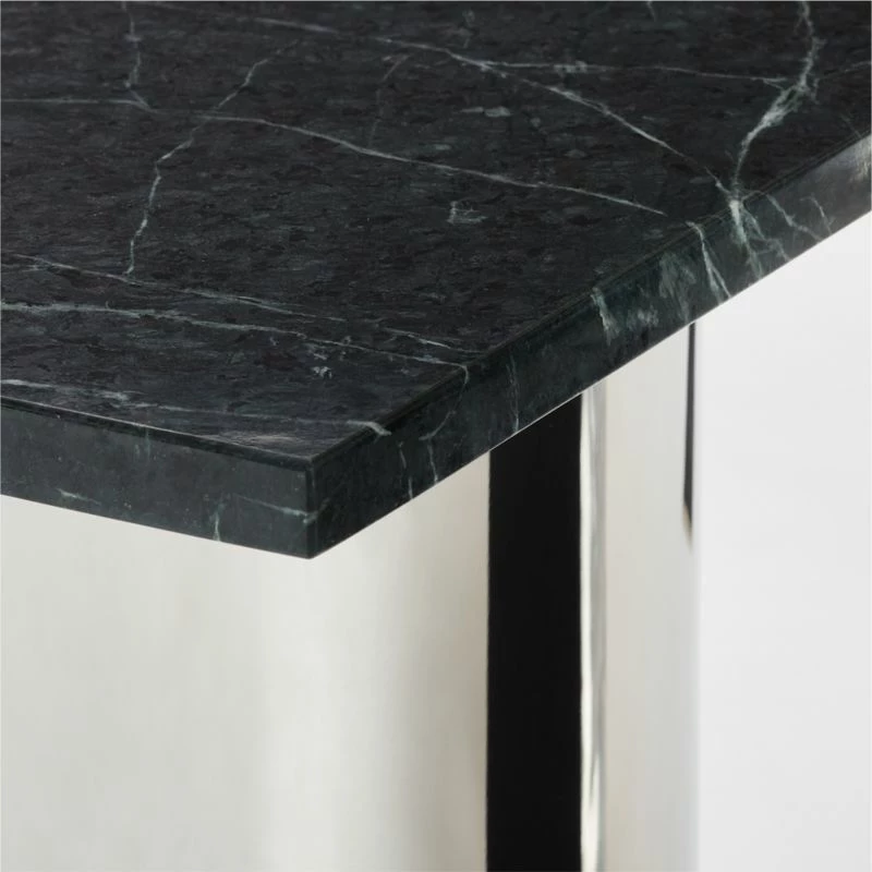 Mermelada Estudio’s ’70s Modernism inspired marble-topped table demands attention in any space. Set atop a tubular polished stainless steel base, the rectangular dark green spider marble slab top adds a luxurious feel for a sophisticated tabletop. Due to the activity inherent to natural stone, each piece will be uniquely yours. CB2 exclusive.