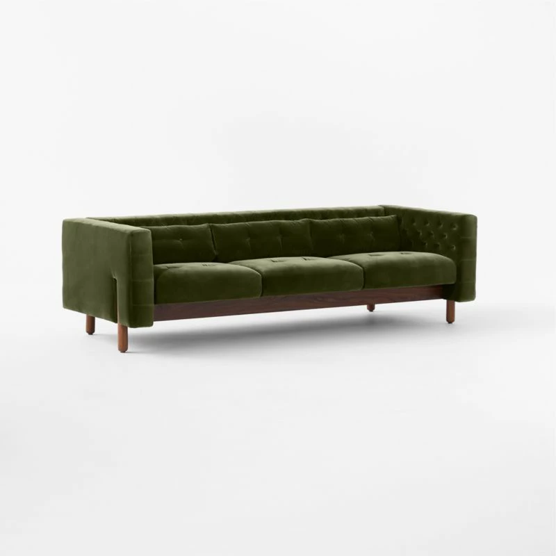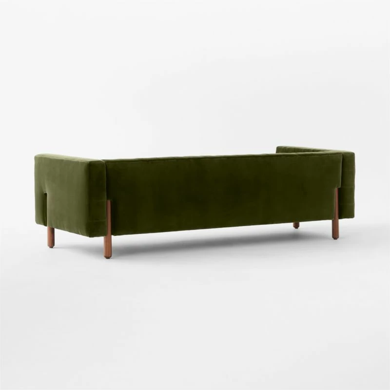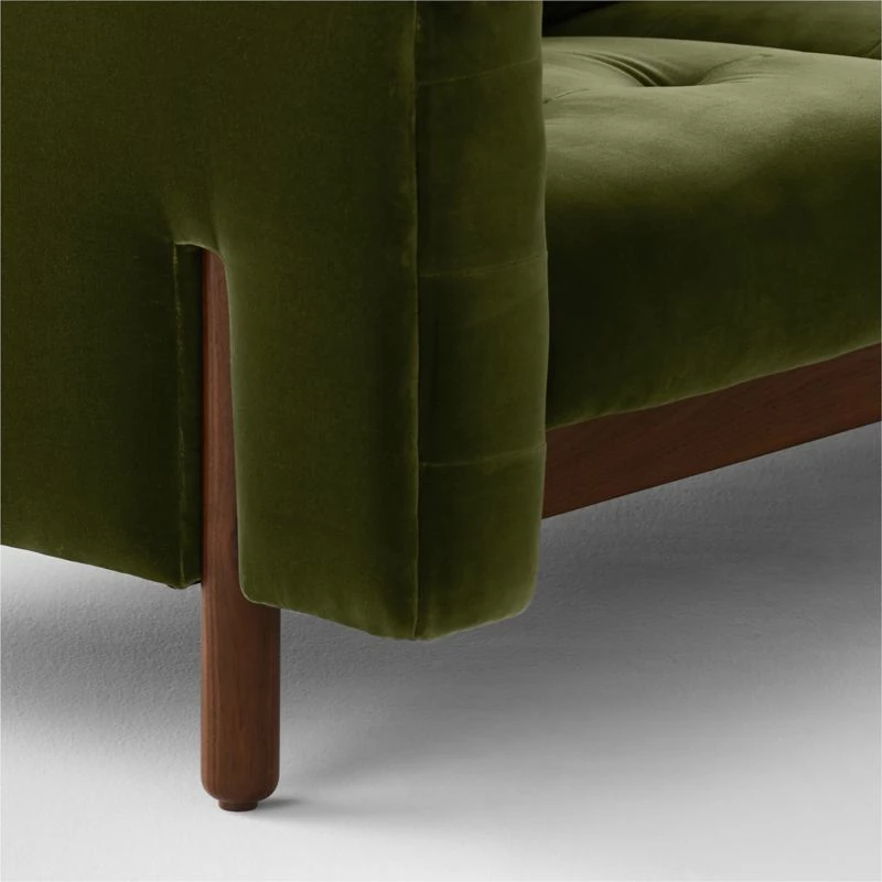 This sleek, low sofa was originally created by iconic Italian designer Gianfranco Frattini for the fashionable Restaurant St. Andrews in the heart of old Milan. Now, a modern classic returns with the same spirit of the original design, reimagined in a rich, olive green-colored velvet with room for three. Period-authentic details include hand-sewn button tufts on the interior sides and cushions, along with the inset walnut legs that are characteristic of the designer’s signature style. CB2 exclusive.