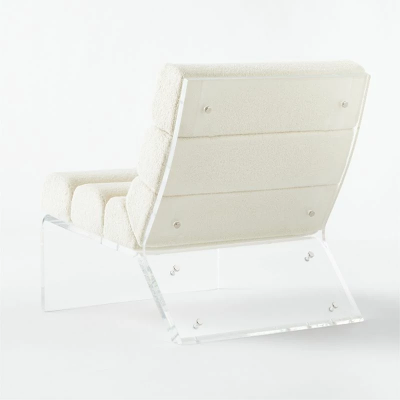 Sculptural and plush statement chair by Mermelada Estudio mixes all the right materials. Inspired by a vintage ’70s chair, horizontal channels of ultra soft white boucle fabric line a sculpted acrylic base. Polished nickel hardware adds finishing details to the back. Learn more about Mermelada Estudio on our blog. CB2 exclusive.
