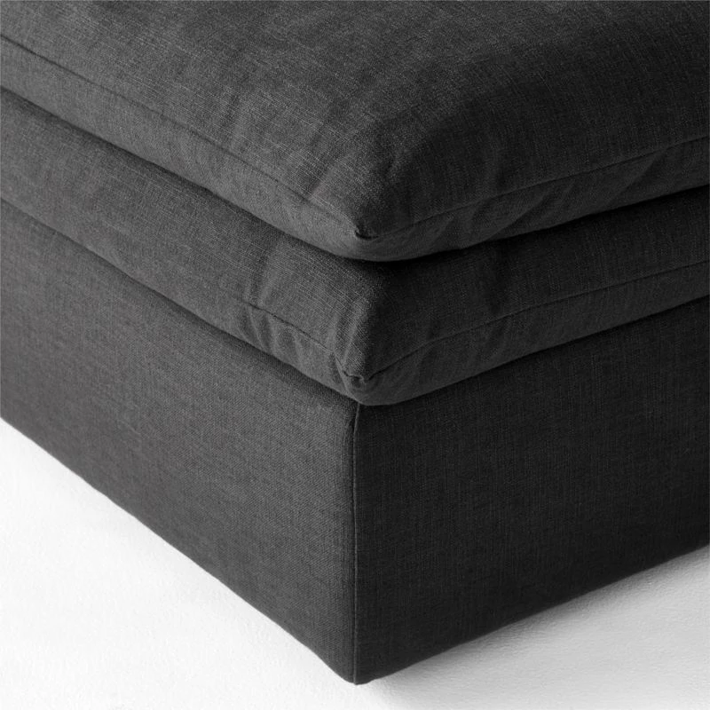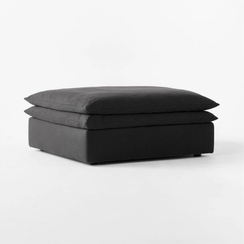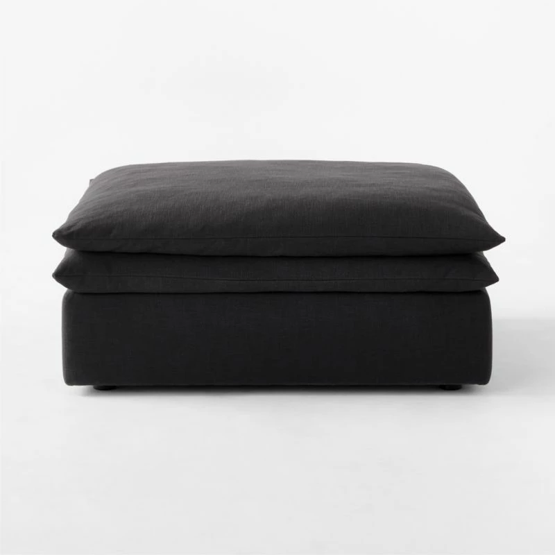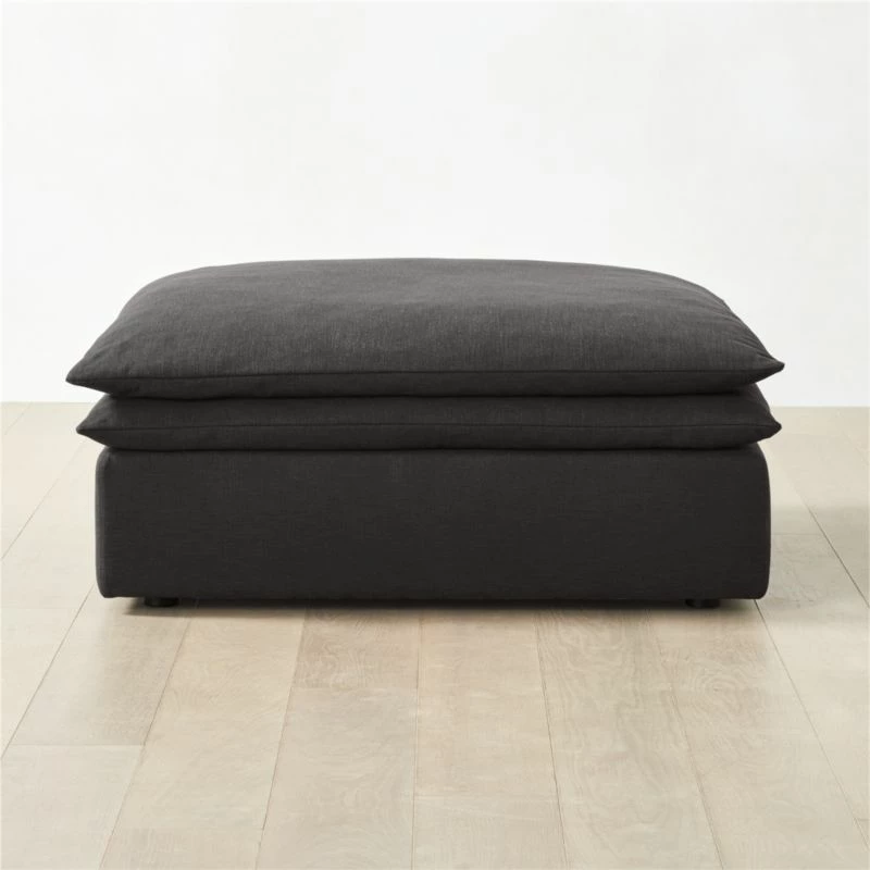 Low, oversized linen ottoman is casually chic while maximizing comfort.. Double-stacked pillow-like seat cushion is upholstered in a charcoal black easy-care performance linen blend, creating an unbelievably soft place you’ll never want to leave. Combine it with other Mattea pieces to create a sectional to fit your space. CB2 exclusive.