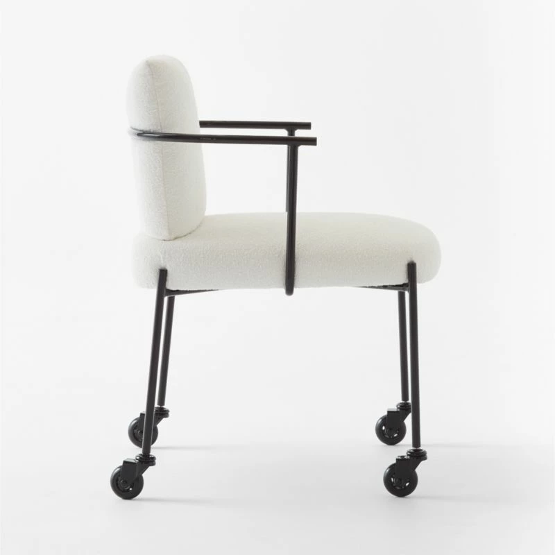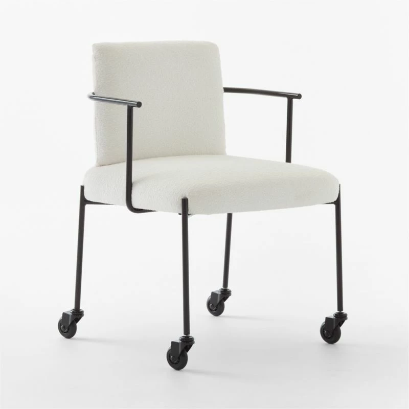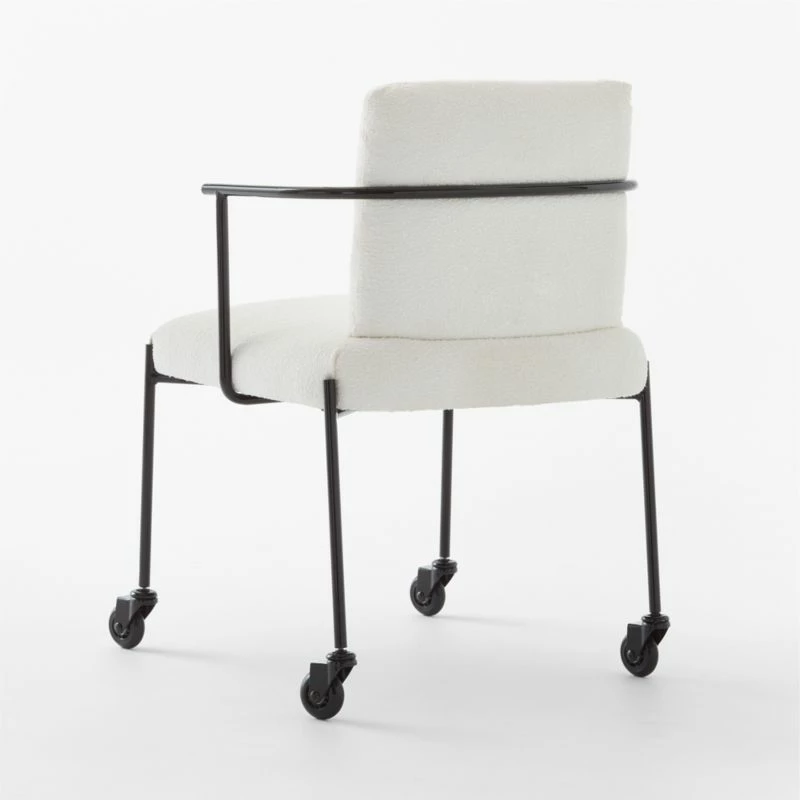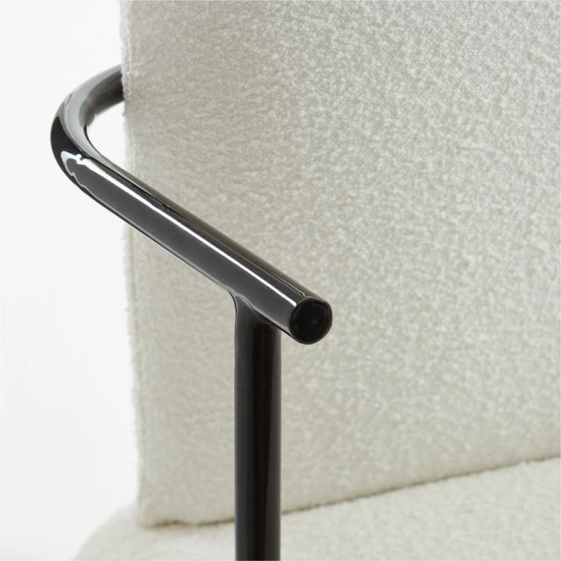 Office seating by Mermelada Estudio offers a study in contrasts. A slim frame, powdercoated in glossy black, supports plush cushions swathed in cotton-rich white bouclé. Attached back cushion, unencumbered by visible hardware, appears to float from behind. Casters allow easy gliding in the home office, dining room or vanity. CB2 exclusive.