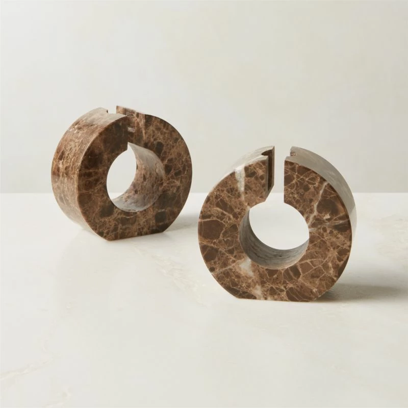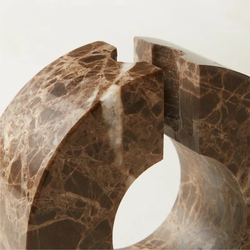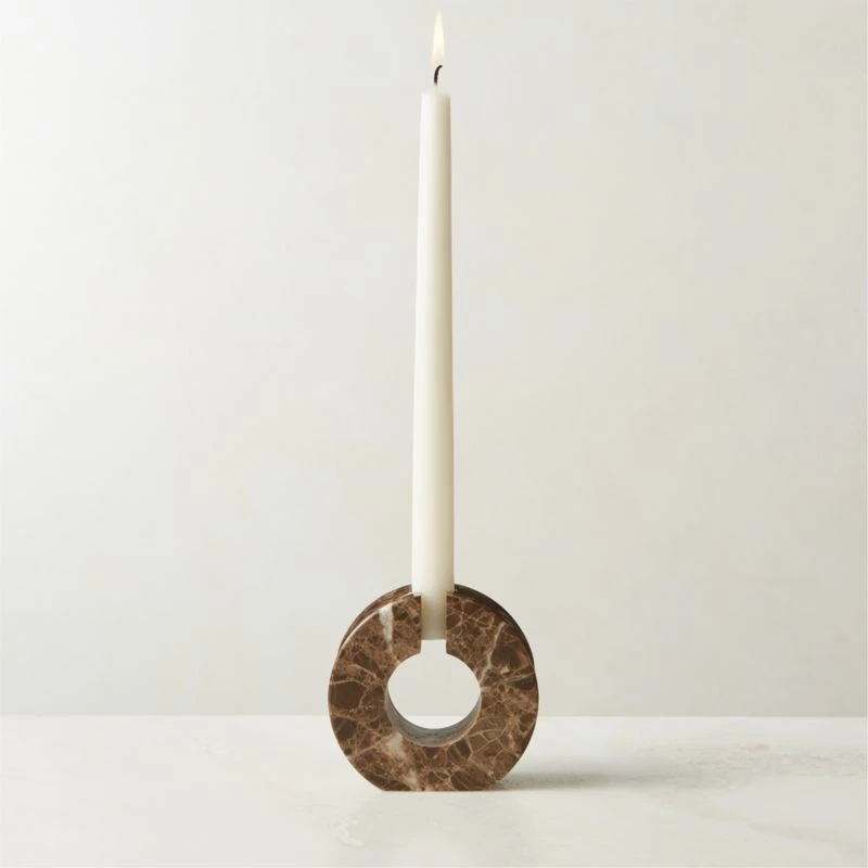 Carved from a piece of exquisite Dark Emperador marble, this candle holder features unique marble activity in tones of browns and greys. Use it as decor, or put a taper candle in place to make it appear to be suspended in the air. Due to the characteristics of marble, each piece will be unique. CB2 exclusive.