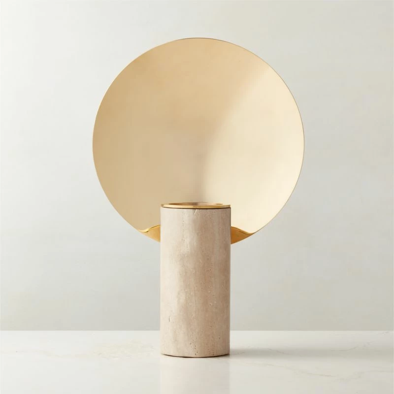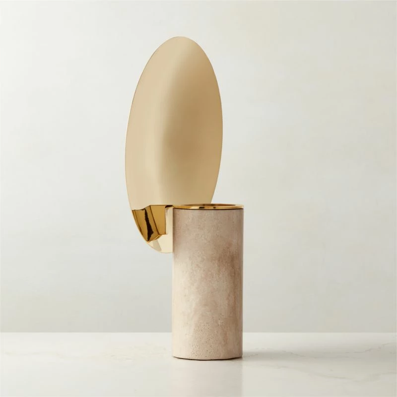 A standalone piece made to spark conversations, vase by dach&zephir features a brass shield that reflects and amplifies the colors and shapes of the flowers within the travertine base. Each travertine piece features unique veining and activity, while the brass shield will develop a gorgeous patina over time. Inspired by Creole Carnaval and its outsized, colorful costumes, it’s a stunning, sculptural celebration of texture and form. CB2 exclusive.