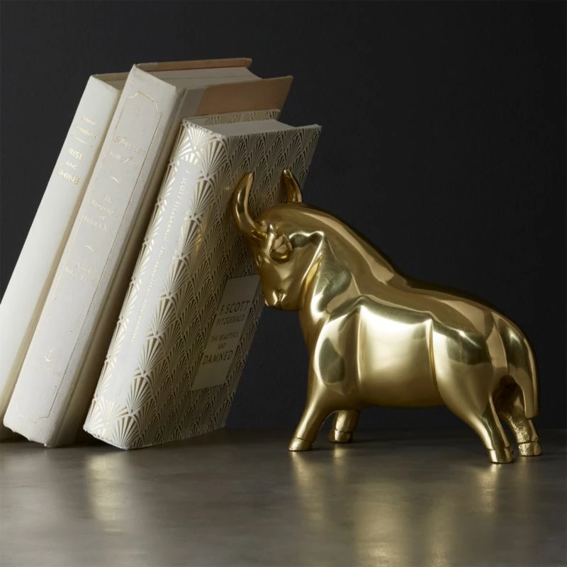 Decorative gold door stopper holds steady—no bull. Press flat side with horns up against the door for full support; equally sharp as a bookend. CB2 exclusive.