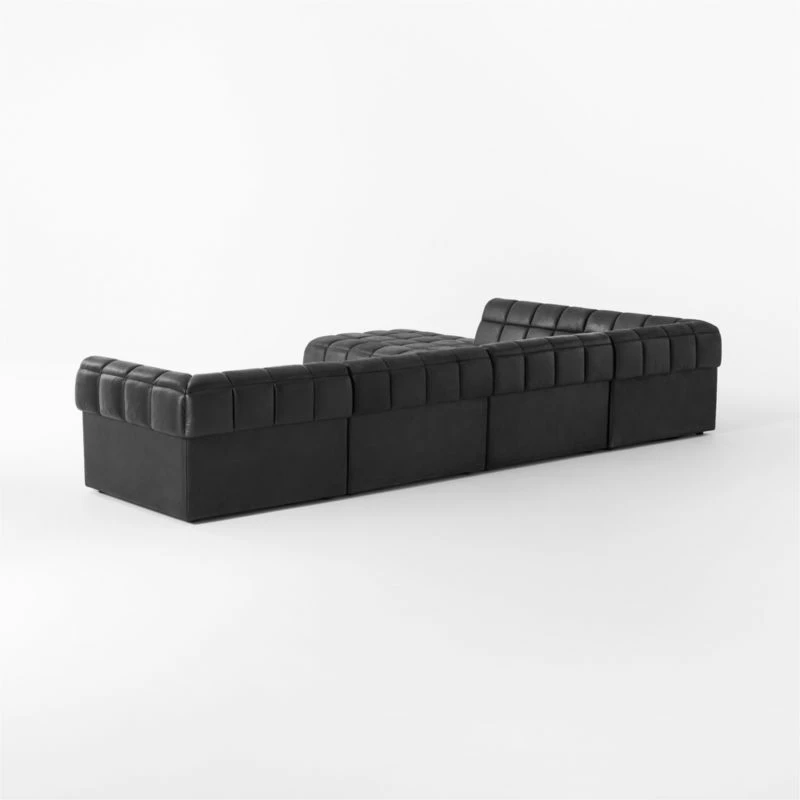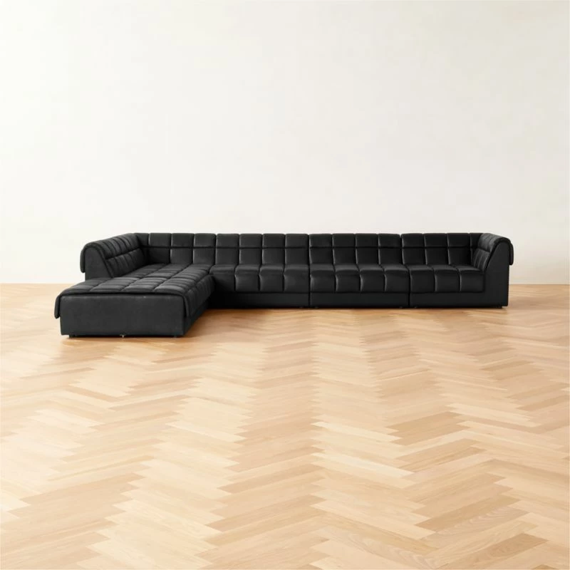 Designed in Barcelona by Mermelada Estudio, black leather sectional sofa has a low profile designed for lounging. Deep, wide ’70s-influenced silhouette evokes the era of conversation pits, with clever construction details such as square tufting and slim cushions that attach to the frame. Wrapped in gorgeous black Moore & Giles leather and crafted with solid birch certified sustainable by the Forest Stewardship Council ® (FSC), it’s part of a modular sectional system that can be repositioned to suit a variety of seating needs. CB2 exclusive.