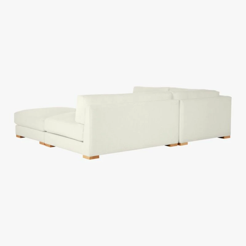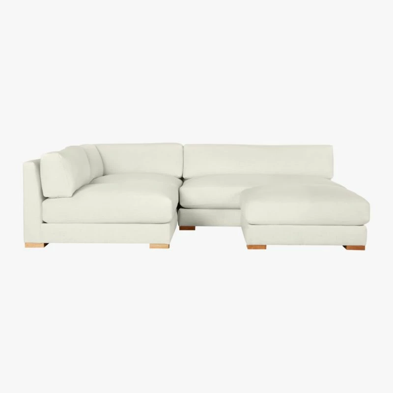 Long, lean, super deep four-piece sectional lounges low on four solid hardwood feet—an elevated update that appreciates high-end craftsmanship and honest materials. Clean silhouette has a plush, pillowed feel thanks to the improved feather-down cushion design. Soft white linen-blend upholstery plays well against the contrasting hardwood feet. Sectional set includes armless chair, corner chair, ottoman and apartment sofa. Can be configured in various ways. CB2 exclusive.