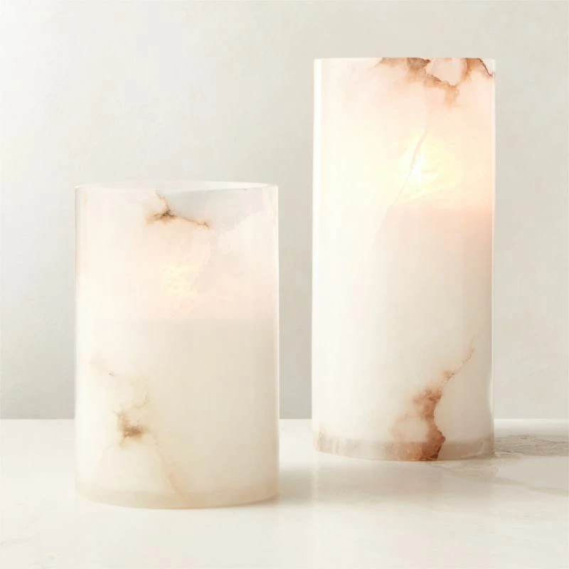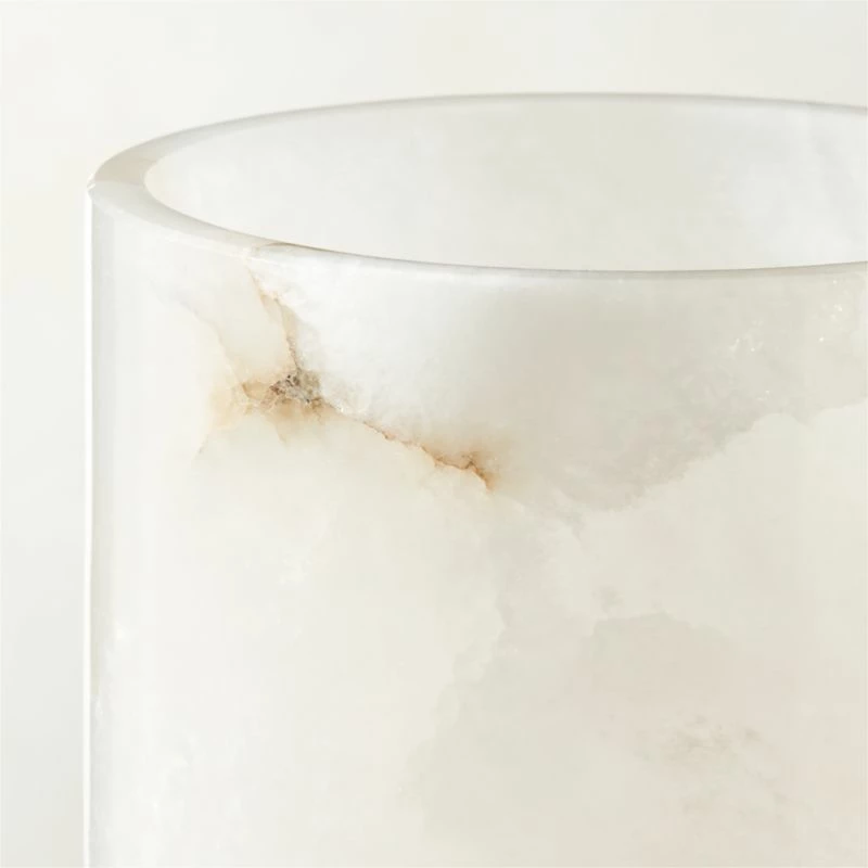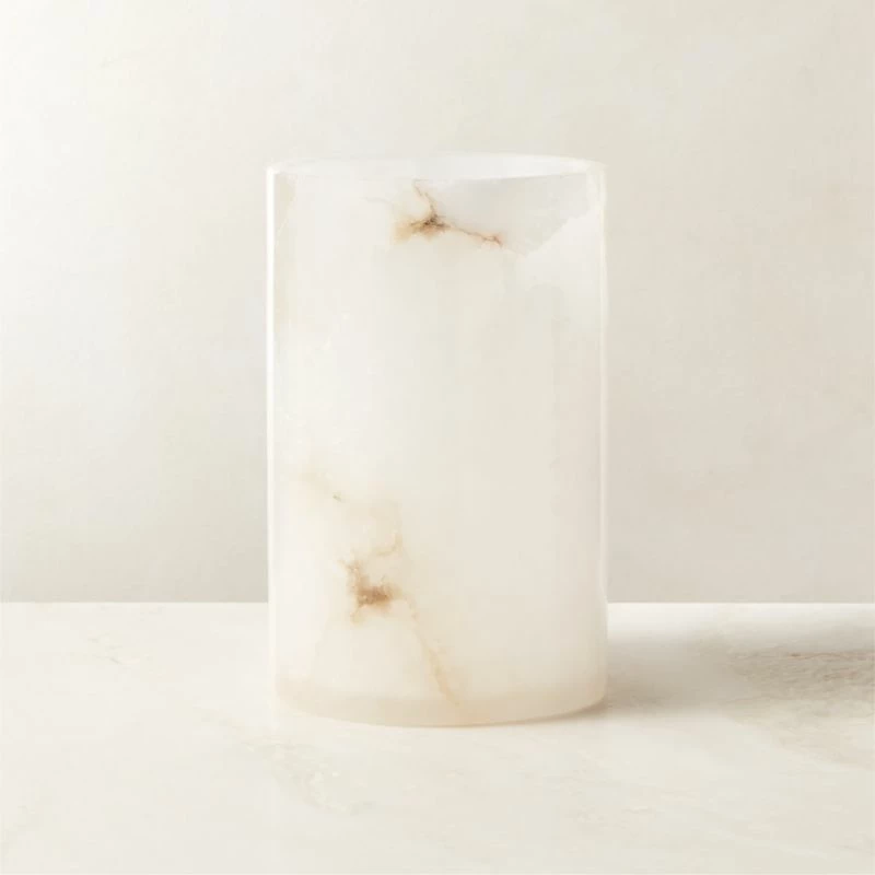 Small candle holder begins as a solid piece of pure alabaster, then is carefully carved into an elegant cylindrical shape. Polished to a shine, it becomes luminous when a pillar candle flame flickers within. As alabaster is a natural stone, each piece will have variations that ensure its unique beauty. CB2 exclusive.