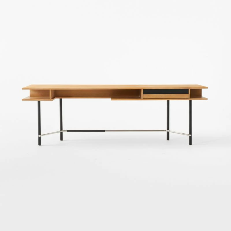 Believed to be among Gianfranco Frattini’s earliest designs, this well-proportioned desk was recreated from vintage black and white photographs. In staying true to its 1950s origins, our update retains the unique cutouts and spaces, with details such as a rubber-wrapped foot rest and solid wood drawer guides pulled directly from Frattini’s found photograph. Satin black powdercoated legs and a champagne brass crossbar beautifully complement the natural beauty of the wood, which is certified sustainable by the Forest Stewardship Council ®. The desktop and shelves are made with richly grained white cerused oak, with a black ebonized oak drawer that pulls out for dramatic contrast. Originally designed for an architect to accommodate rolls of drafting paper, the desk is well-suited for all modern professional pursuits. CB2 exclusive.