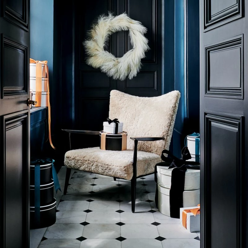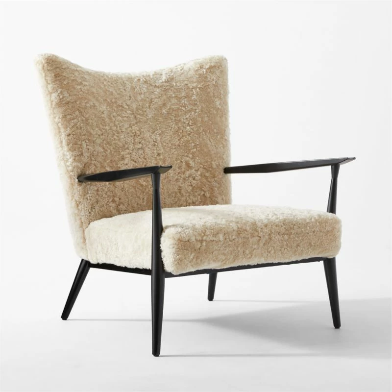 Open-arm lounge chair by Paul McCobb sports genuine shearling upholstery on a black satin FSC ®-certified beechwood frame. Has a bit of an oversized feel to it despite not having that large of a footprint—perfect for a bedroom or living room corner. CB2 exclusive.
