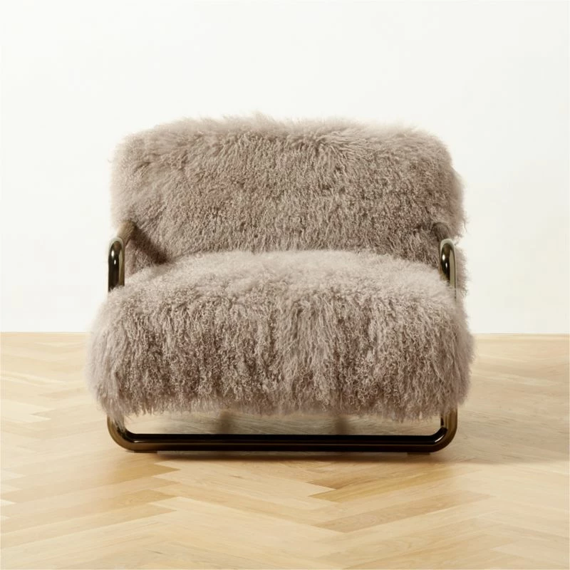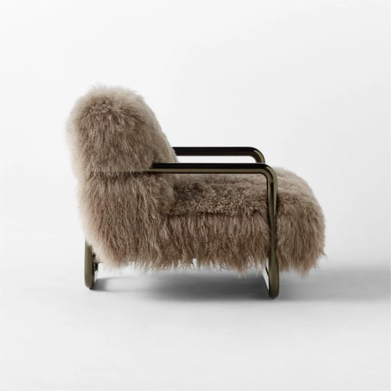 Accent chair by Jannis Ellenberger juxtaposes luxurious Mongolian sheepskin with a sleek tubular frame. Blackened brass metal is a textural contrast against the sheepskin’s soft and shaggy feel. Foam cushion offers a supportive, firm sit. Due to the nature of sheepskin, the grey tones may vary from piece to piece. CB2 exclusive.