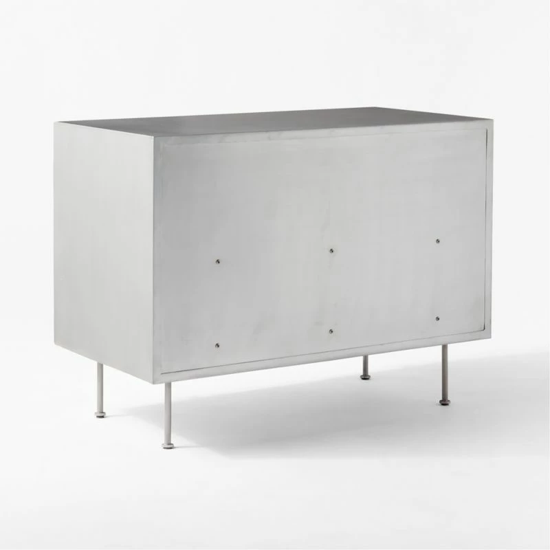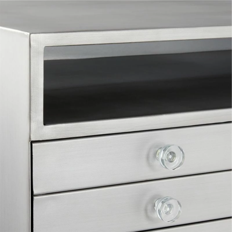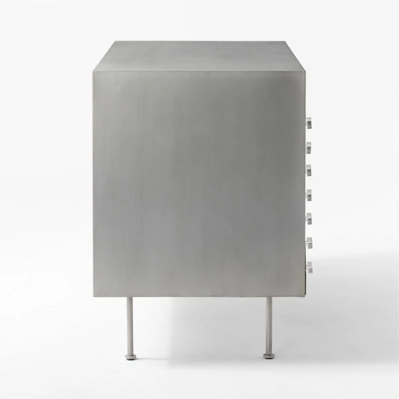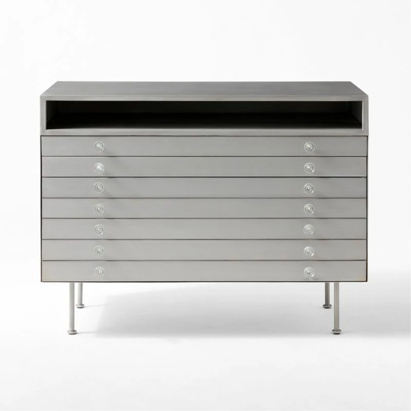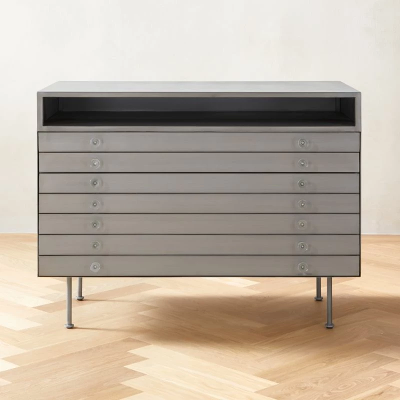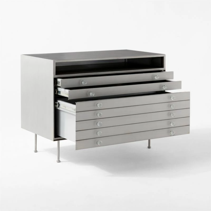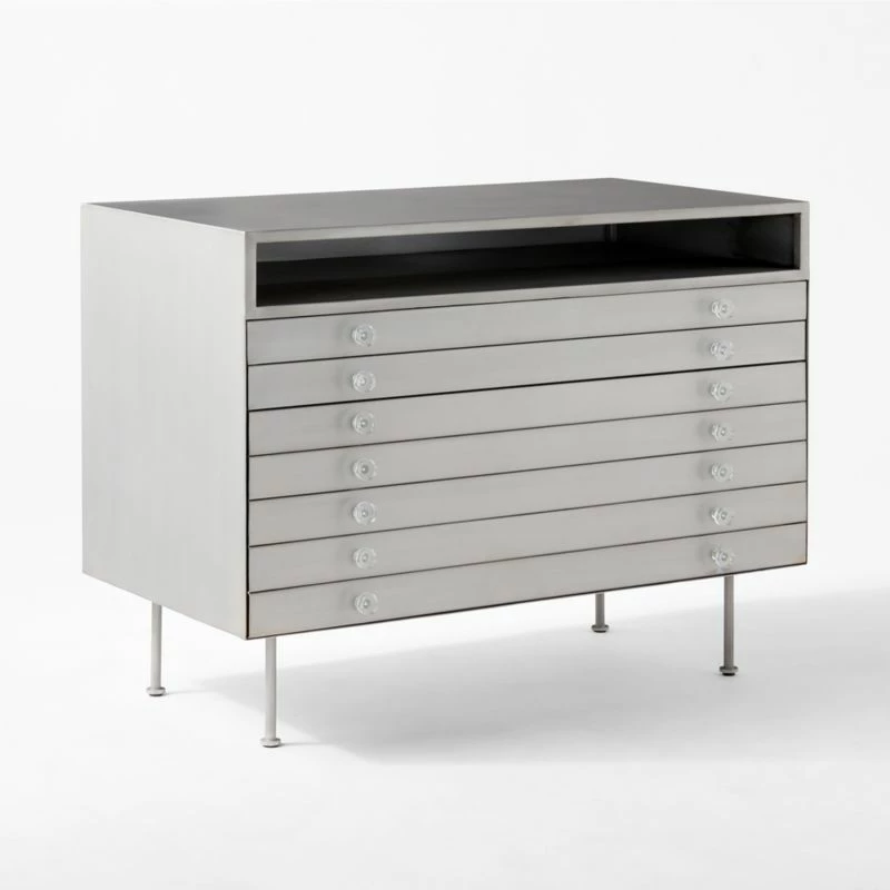 Raw steel file cabinet was designed specifically by VUUE to fit the width of drafting papers—an architect’s dream. Large drawer also fits legal/letter files. Custom cast glass knobs juxtapose with industrial stainless steel. CB2 exclusive.