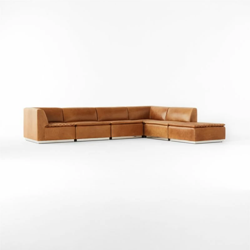 Scaled just right for smaller spaces, sectional sofa by Nicholas Obeid makes the most out of its footprint. Set atop a polished stainless steel plinth base, seating has semi-detached channel-tufted cushions wrapped in buttery cognac leather. It’s an incredibly comfortable sectional sofa in a very of-the-moment finish. CB2 exclusive.