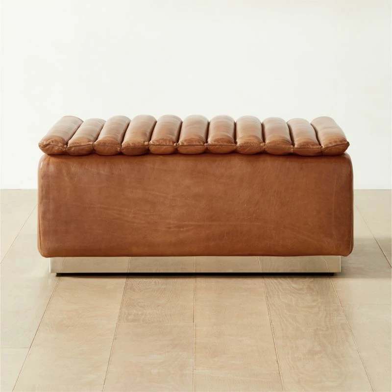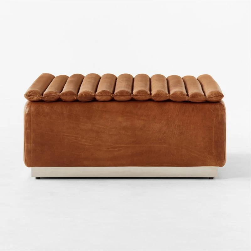 Scaled just right for smaller spaces, leather ottoman by Nicholas Obeid makes the most out of its footprint. Set atop a polished stainless steel plinth base, its surface has a semi-detached channel-tufted cushion wrapped in a buttery cognac leather. Makes a statement on its own or when combined with other Salon pieces to create an incredibly comfortable sectional sofa. CB2 exclusive.