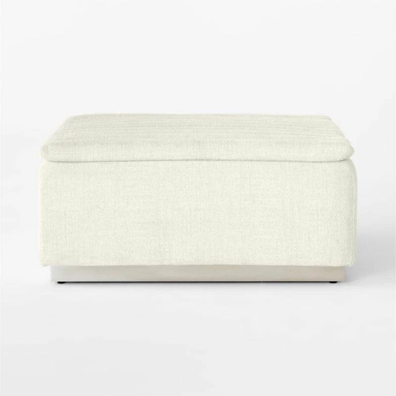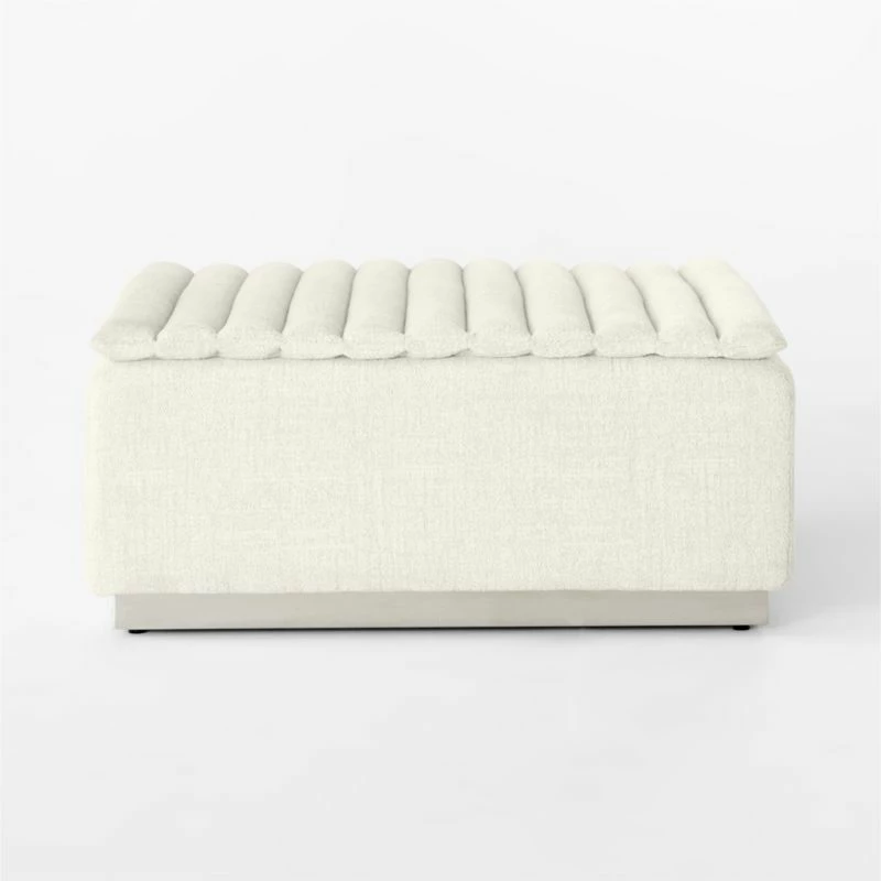 Scaled just right for smaller spaces, ottoman by Nicholas Obeid makes the most out of its footprint. Set atop a polished stainless steel plinth base, seat has semi-detached channel-tufted cushion wrapped in a soft, ivory chenille upholstery. Mix and match Salon pieces to create an incredibly comfortable sectional sofa. CB2 exclusive.