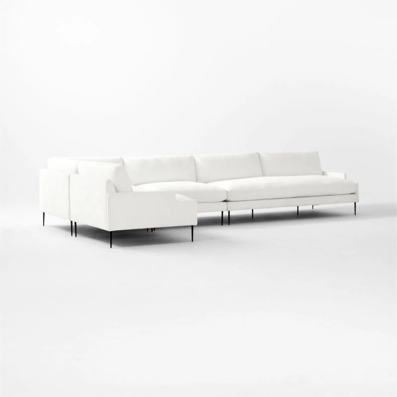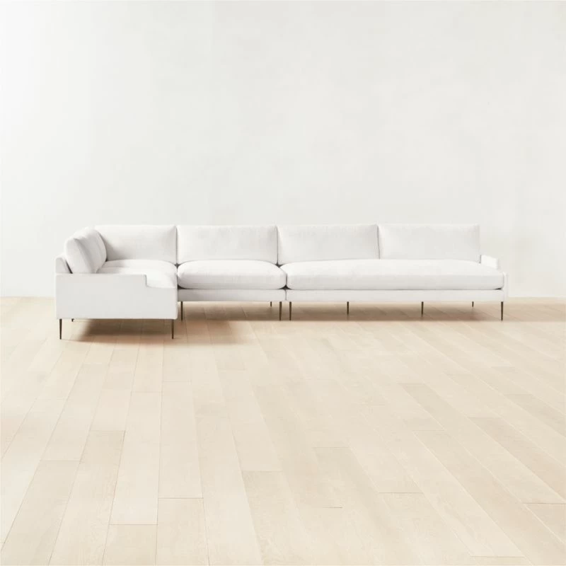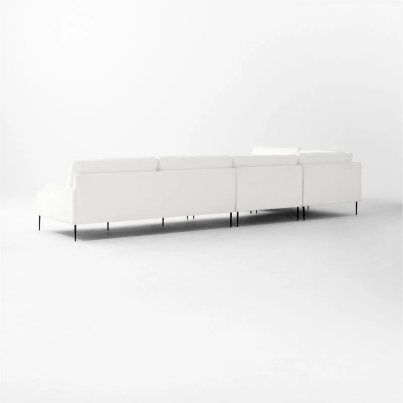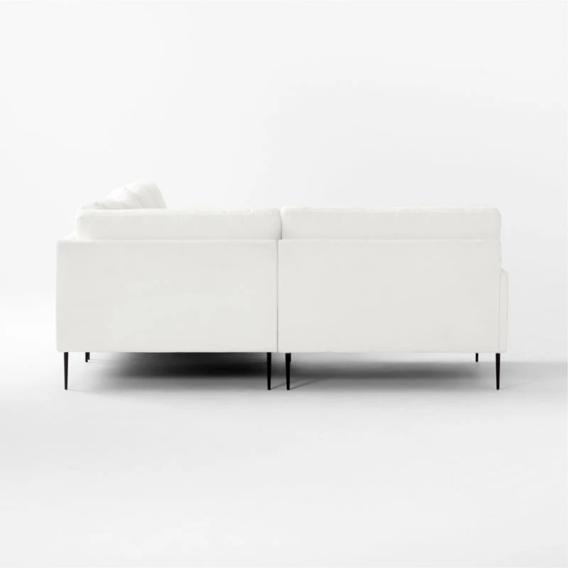 Sectional sofa by Mermelada Estudio feels traditional at first, but upon closer inspection reveals modern sensibilities—like thin-profile arms and a sleek silhouette. Tall, needlelike metal legs finished in a lustrous black powdercoat create graphic contrast with white upholstery. CB2 exclusive.