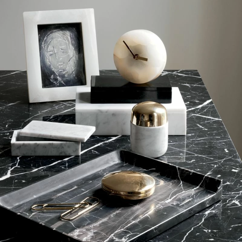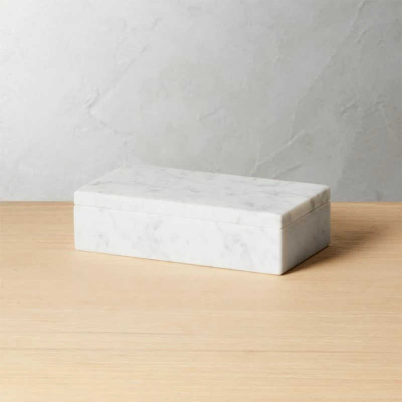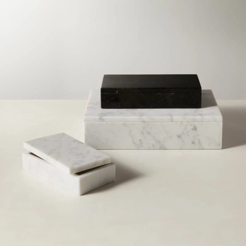 Marble storage box stores knickknacks on dressers or desks. Veining will be unique in each piece due to natural properties of marble. CB2 exclusive.