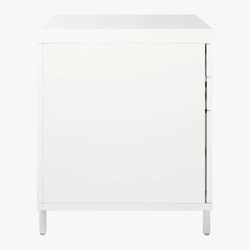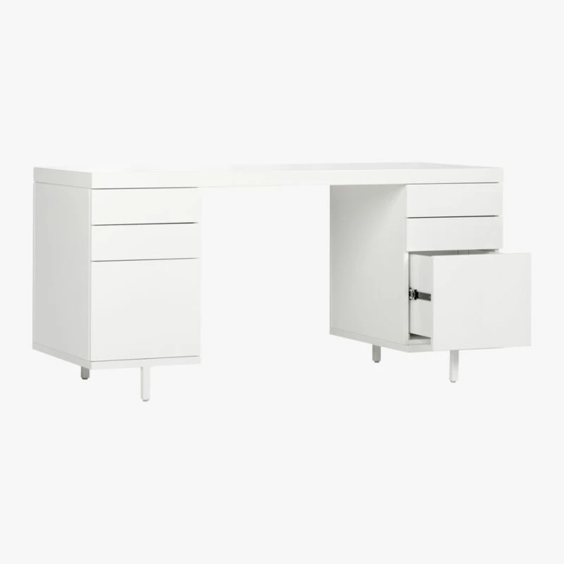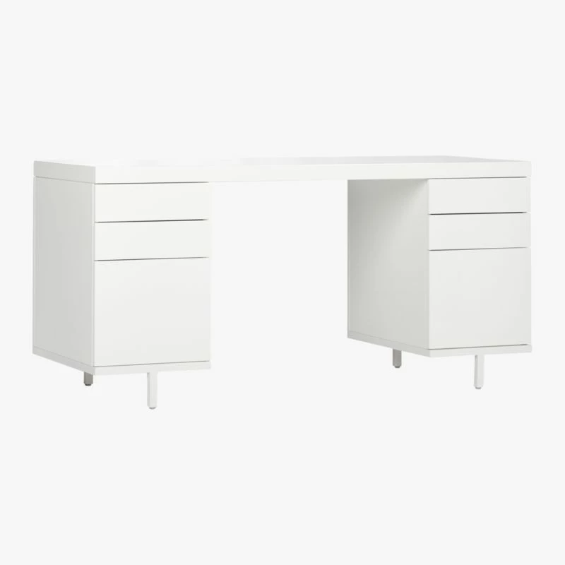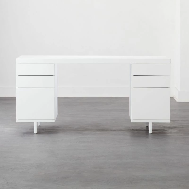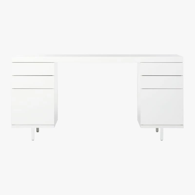 Minimalism goes to work in this clean modular desk. Engineered wood desktop lays out a pristine workspace in glossy white. Slim, powdercoated aluminum frame with hidden hardware hosts two sets of drawers that stash away anything that distracts from this spotless beauty. Learn about Donna Piacenza on our blog. CB2 exclusive.