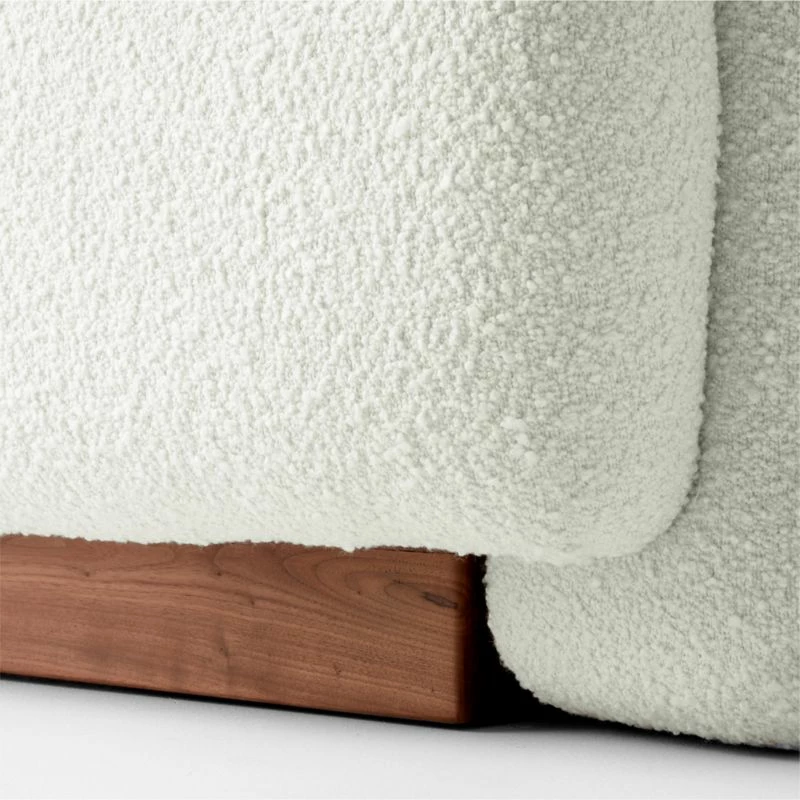 Designed by Lawson-Fenning, the Terrain furniture collection consists of modular pieces that can be arranged to create different environments. Sectional sofa features plush bouclé upholstery. Walnut base, certified sustainable by the Forest Stewardship Council ®, reveals warm tones and striations that vary from piece to piece. Includes right-armed chair, two armless chairs, corner chair and ottoman that come together as one. CB2 exclusive.