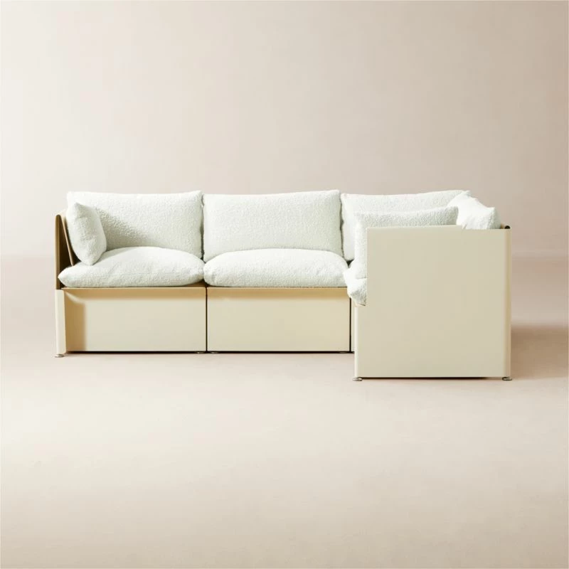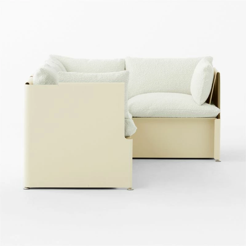 Reminiscent of the substantial furniture commonly found in Caribbean homes, sectional sofa by Axel Mert features a modern powder-coated iron frame in lieu of traditional wood. Defying expectations of material pairings, it explores the contrast between rigidity and plushness with ivory boucle cushions and pillows. All in all, a distinctive, storied and thoroughly contemporary silhouette. CB2 exclusive.