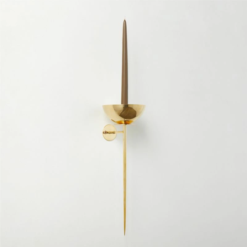 Designed by Brett Beldock, candle wall sconce is beautifully crafted of solid unlacquered brass for a living finish that will naturally patina over time. Rounded platform tapers to a point, creating an elegant shape that makes a statement. Sized for a pillar candle, but can also hold a taper using the brass nib hidden within the platform. CB2 exclusive.