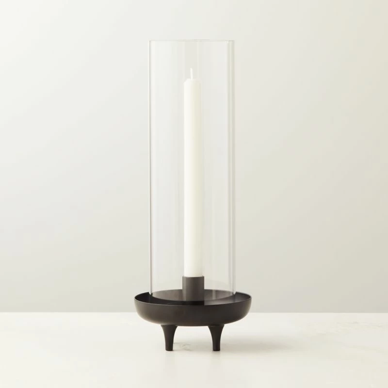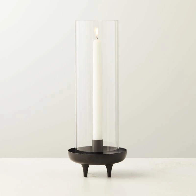 Stainless steel and glass make for an elegant hurricane sized perfectly for tapers. Matte black base complements the glass top, while the simple round silhouette keeps it sleek. CB2 exclusive.