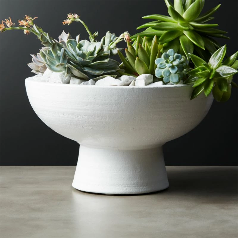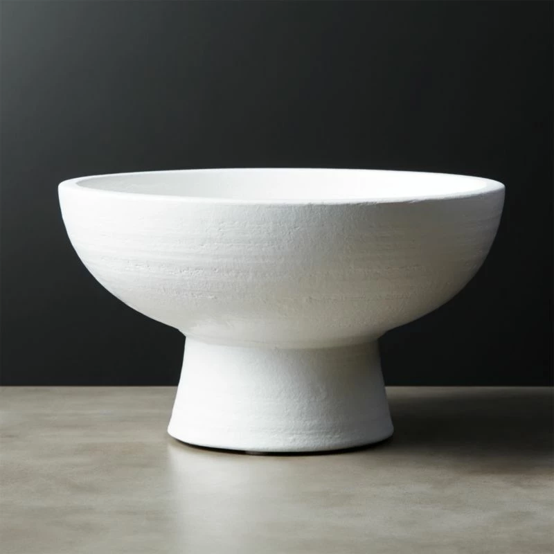 Sculptural piece is made for display. Ceramic pedestal bowl surfaces linear texture and opens wide to hold decorative objects, faux succulents and everyone’s attention. CB2 exclusive.